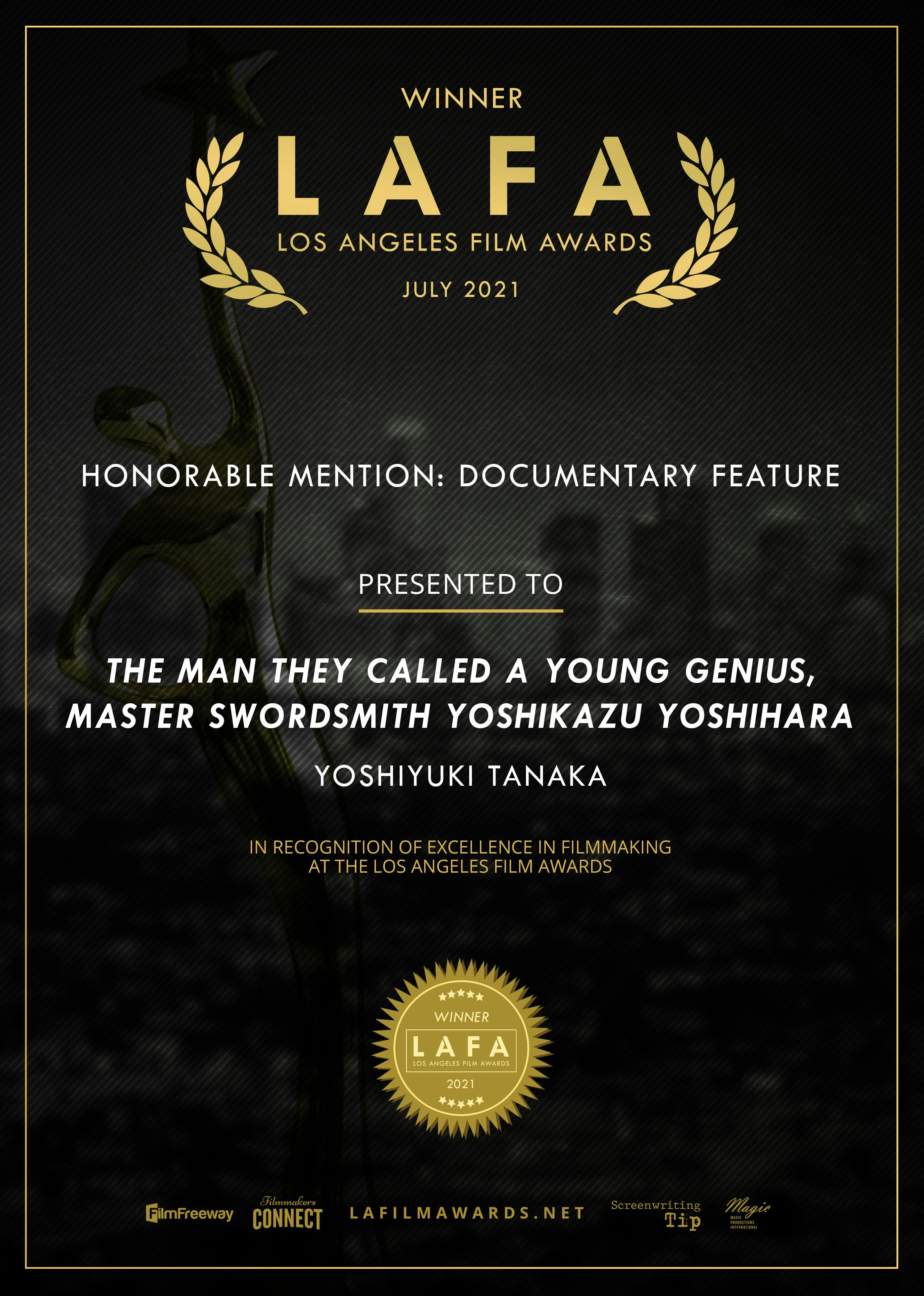 皆様いつも、応援いただきありがとうございます。「Los Angeles Film Awards (LAFA)」 Documentary Feature部門にてノミネートの連絡が来ました。8/2にベスト作品の発表・授賞式です。Congratulations! We are excited to accept The man they called a young genius, master swordsmith Yoshikazu Yoshihara as Los Angeles Film Awards Official Selection.The judging team is currently reviewing the selected films and screenplays, and the winners will be announced on August 2nd, 2021.https://www.lafilmawards.net/これから予告編納品なので、ベストを受賞したら、上記で予告が流れるのかな?楽しみです。また、何かありましたら一方的で恐縮ですが、ご報告させていただきます。wahoo.tv監督・製作プロデューサー 田中慶幸