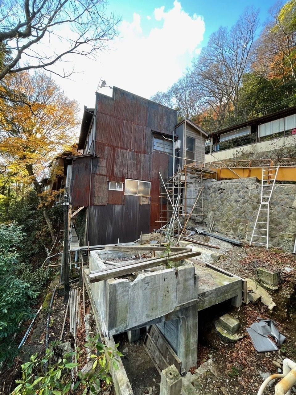 2021/03/13 10:57クラウドファウンディング終了まで残り1週間となりました。目標額には達していないものの、現時点で80人もの方々に支援をいただき大変感謝しています。緊急事態宣言が続く中、ひとまずNARAYA CAFEとOnsen Terraceとの通路となる部分の解体を先週行いました。昨年の厨房移転作業にも関わってくださった大工さんとともに3日間ほどで解体を行いました。私マスターも参戦。昭和20年代に作られた手練りのコンクリート(ブロック積み)をドリルとハンマーを使ってガシガシ壊しました。ひさびさにガテン系の仕事をしたので、全身筋肉痛になりました。道がひらけたところで、設計・大工・造園のメンバーで集まって相談。住宅時にお風呂場部分だったコンクリートの躯体は「面白いから残して活用しよう」というのは全員一致の考えで、そこからお湯を流して「湯滝」のようなものを作るイメージです。ここが広場のコアの部分になります。どんな風になるかはお楽しみ。石を運んで積んでいくことになるので、男衆の協力が必要です。それ以外の斜面部分は階段状の広場にしようと思っています。普段は山を眺めてくつろいだり、テイクアウト物の飲食をしたり出来て、イベント時にはステージを囲む客席として活用できるようなイメージです。模型写真同じアングルからの広場予定地(現在)残り1週間。既に支援いただいた皆さまからも、お知り合いなど、潜在的NARAYA/森メシファンの方にお声かけいただけたら幸いです。宮ノ下は日に日に春の気配です。4月から本格的な作業に入りたいと思います。緊急事態宣言が解除されたら、ぜひ男衆活動も行いたいと思います。今後ともあたたかいご支援をよろしくお願いいたします。 もっと見る