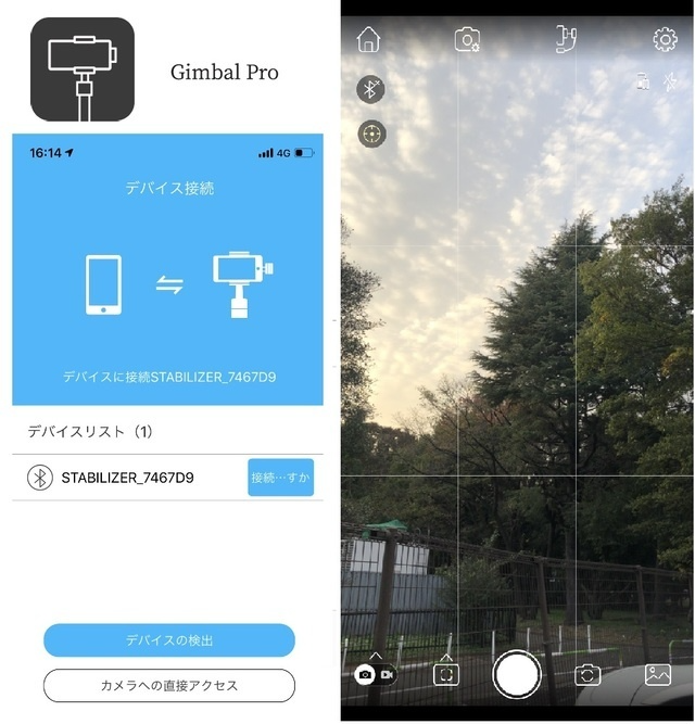 Bluetooth接続はジンバルの電源を入れアプリを立ち上げたらジンバルを選択するだけの簡単接続。