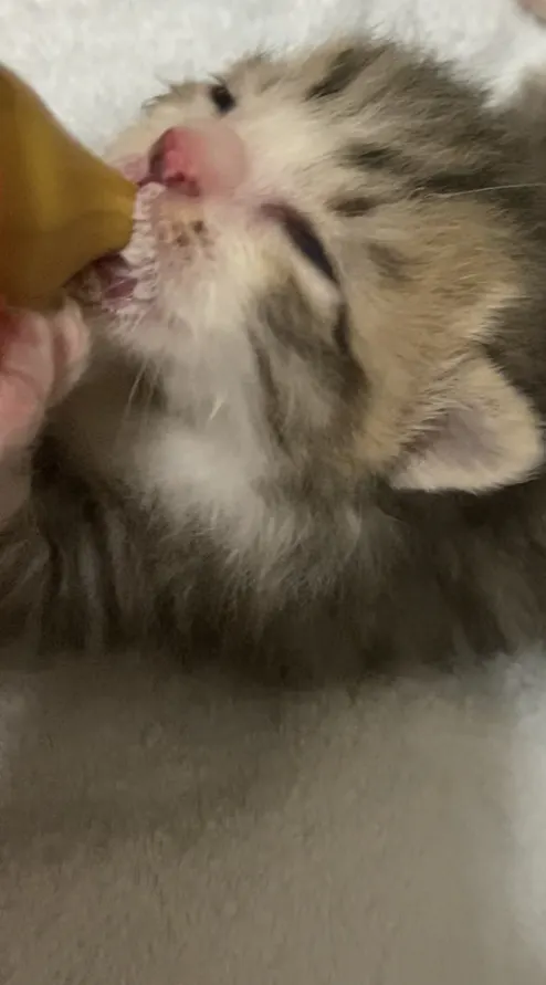ミルクを自分から飲んでくれなくて、シリンジ(針がない注射器のようなもの)で飲ませていましたが、昨日の夜、やっと哺乳瓶を自分で吸って飲んでくれました!