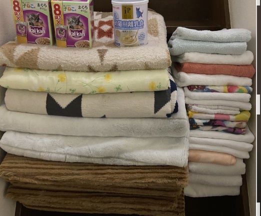 Kお母様からタオル類、K娘さんから子猫さんフードと離乳食のご支援がありました。