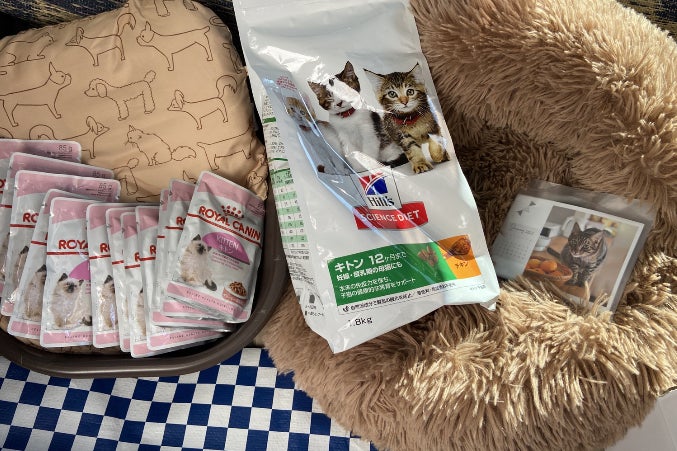 K様から子猫ちゃんフードやタオルベッド等ご支援いただきました。