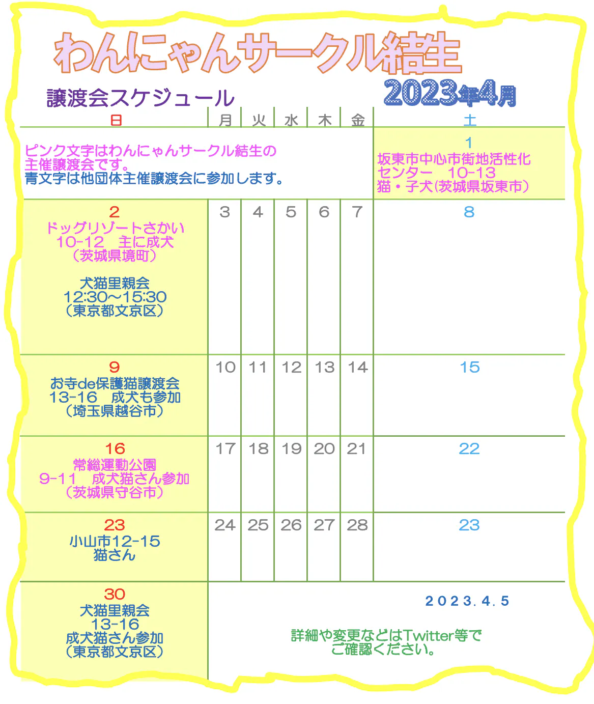 ピンクの文字はわんにゃんサークル結生主催の譲渡会です。