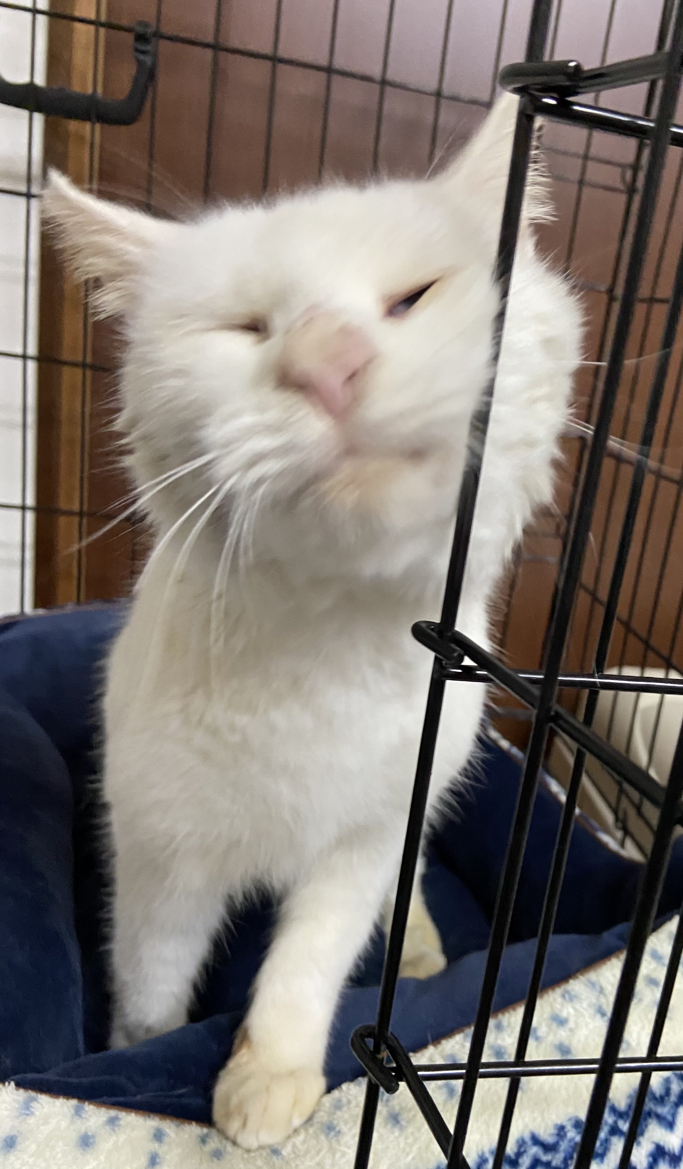 この活動報告の写真の猫さんは、現在保護している さぁくんです。白い体に青いお目目。(ちょっとお目目が奥まっているので写真がうまくとれませんが、実際はもっともっとかわいいです。)