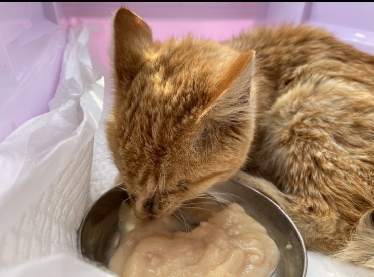 キャリーに入れたらお皿のチュールに気づいて食べ始めました。よかった。お医者様に診ていただき、抗生剤等とノミダニ虫下し。今はおうちであたたかく過ごしています。感染の恐れもあるので、他の保護さんとは完全隔離です。