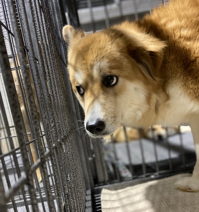 成犬の保護わんたち、ご支援のおかげで大きなケージでくつろいで過ごしています。