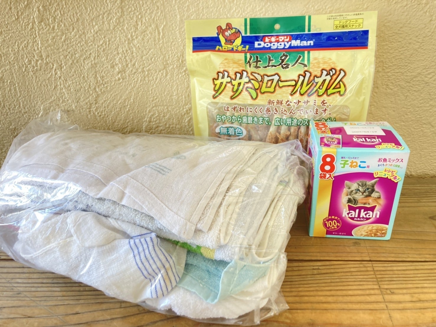 N様から子猫ちゃんフード、わんちゃんおやつ、タオル類のご支援いただきました。