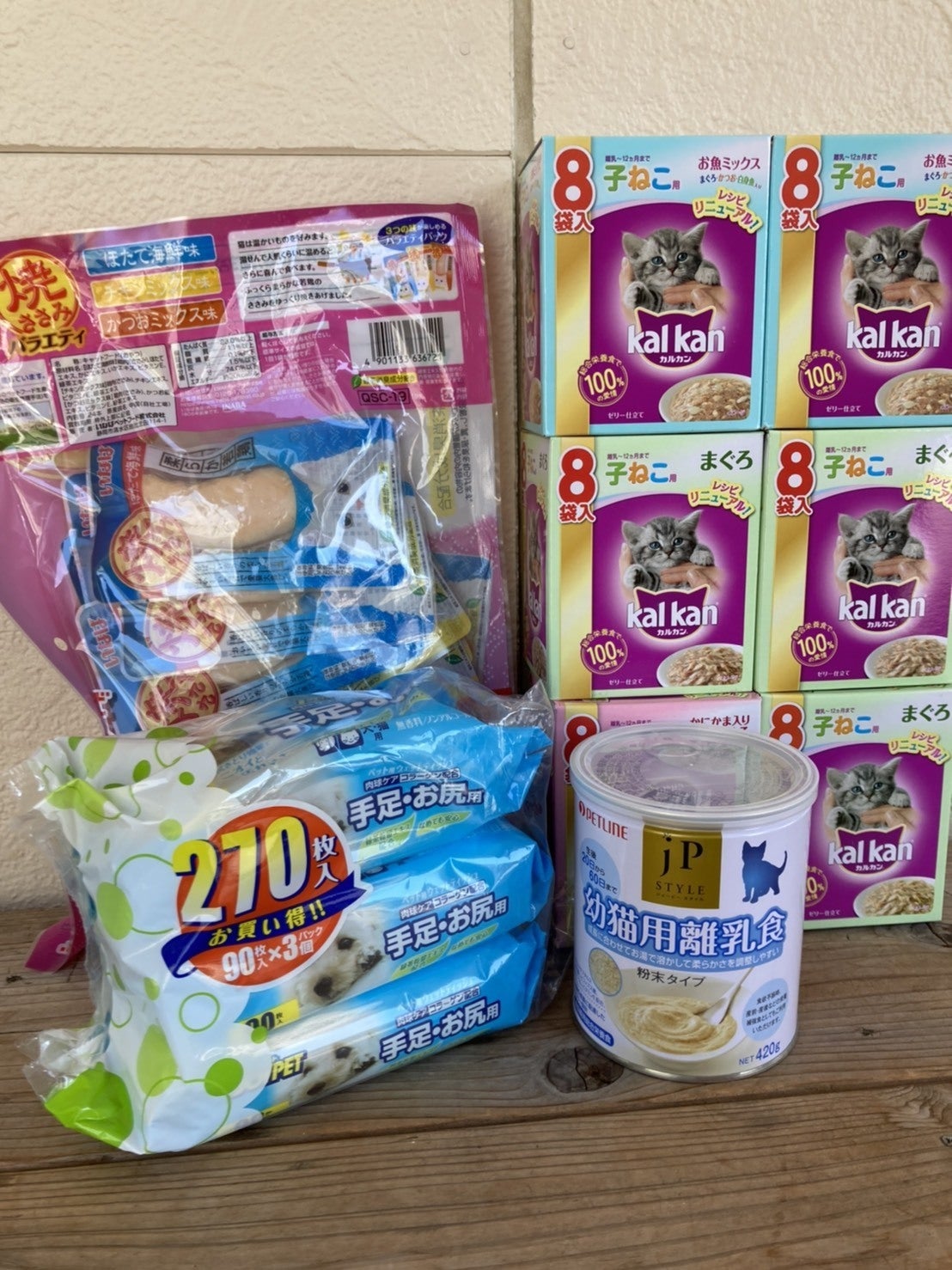 F様から子猫ちゃんフード、おやつ、ペット用ウェットティシュ、猫さん離乳食のご支援いただきました。