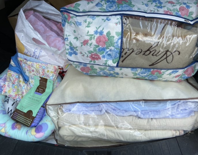 大先輩のY様から毛布、タオルケット、手作りニャンモックとベッド、キャットフード等いただきました。
