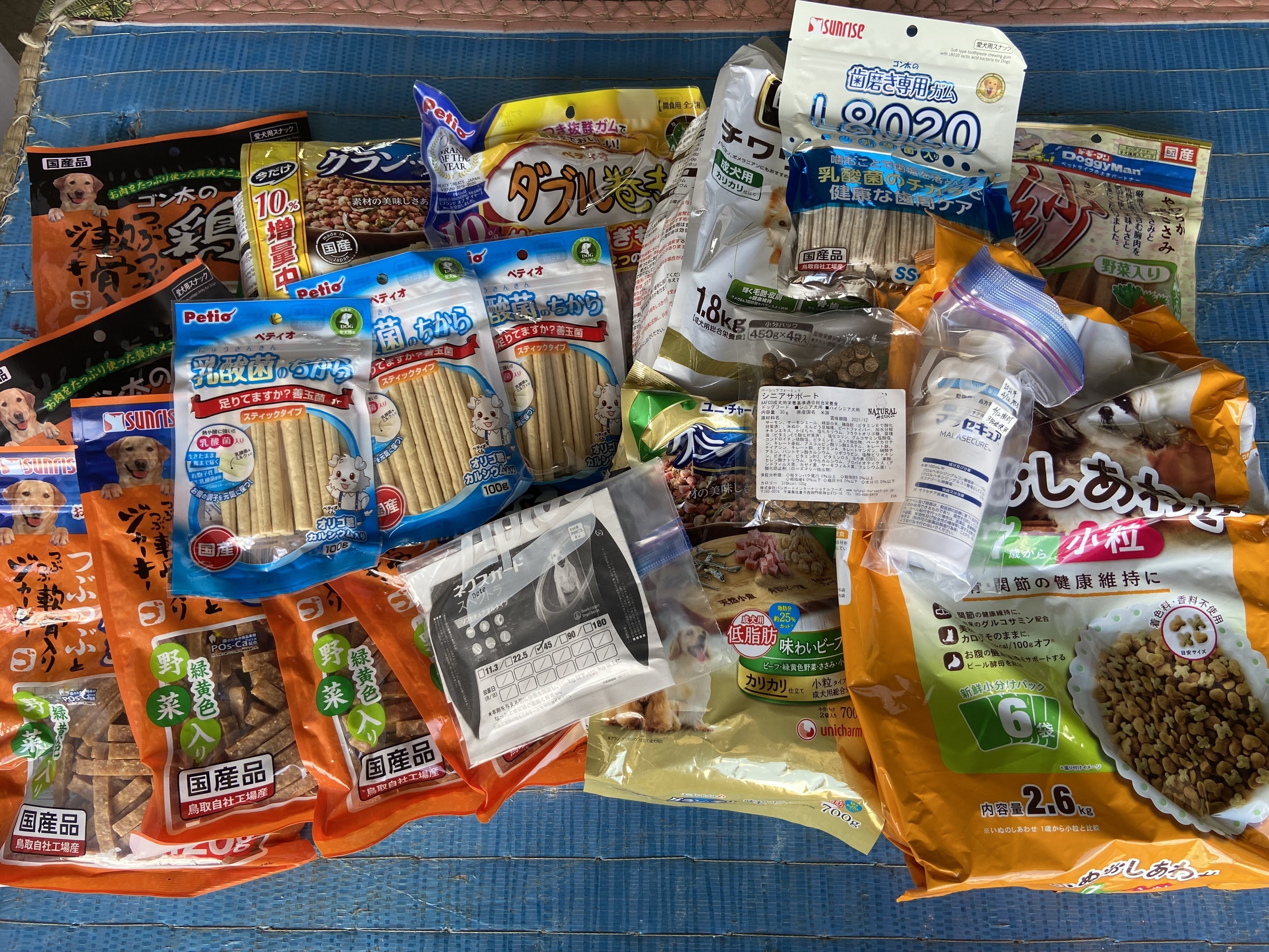 O様からわんちゃんおやつなどの詰め合わせ♪と、たくさんのドッグフードのご支援いただきました。