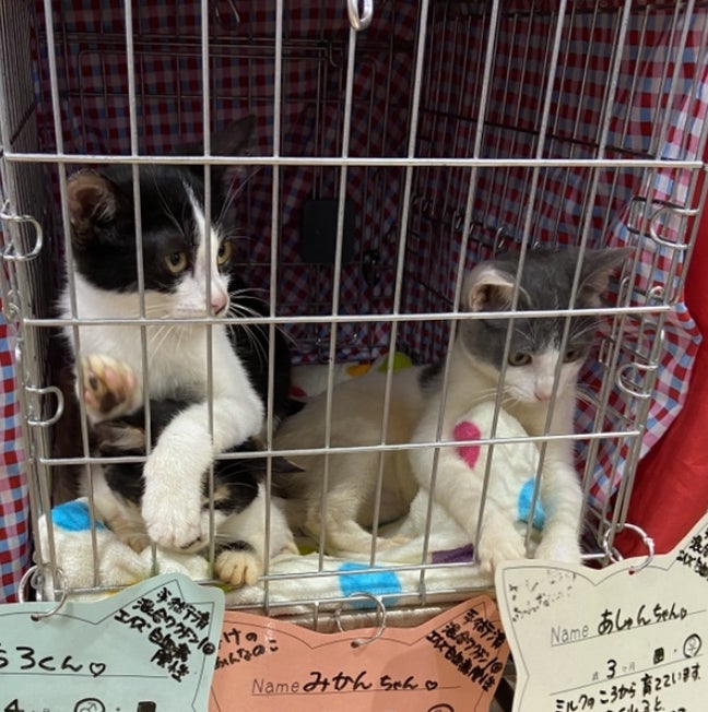 スペースの関係でひとりケージひとつ、ということでしたので、少しきつめかとも思いましたが、三毛猫、みかんちゃん♀、白地にグレー、あしゅんちゃん♀、白黒はちわれ、ちろくん♂の3にゃんの参加。