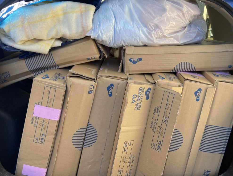 K様からタイルカーペットや毛布等ご支援いただきました。