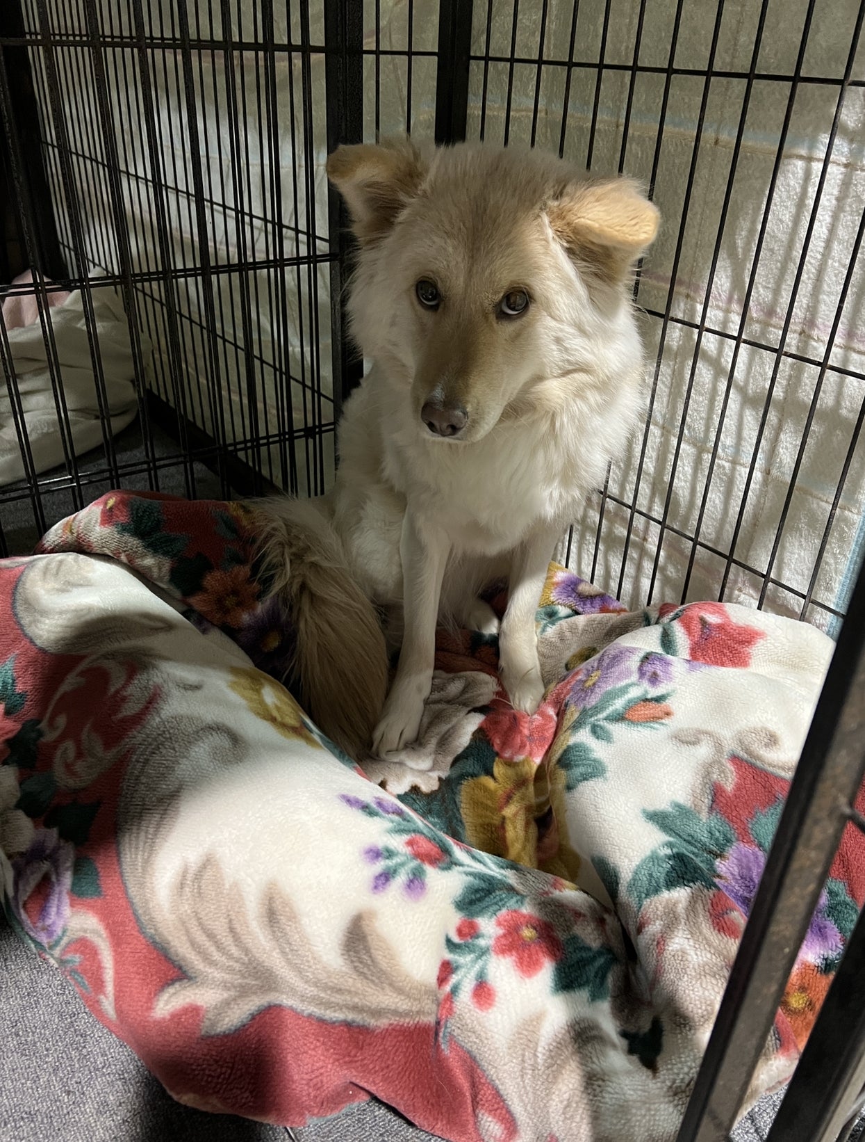 あまり慣れないこも、ケージの中で毛布をベッド状に作り上げたら