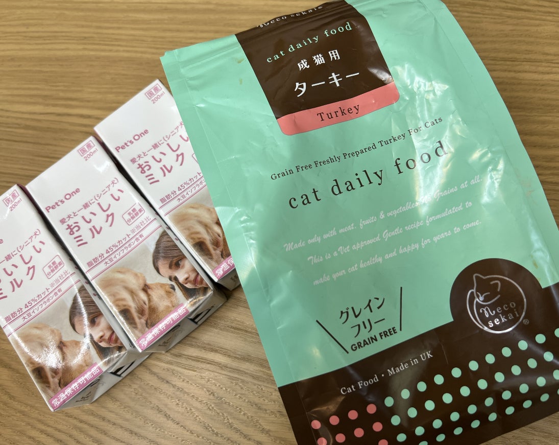 O様から猫さんフードとわんちゃんミルクご支援いただきました。