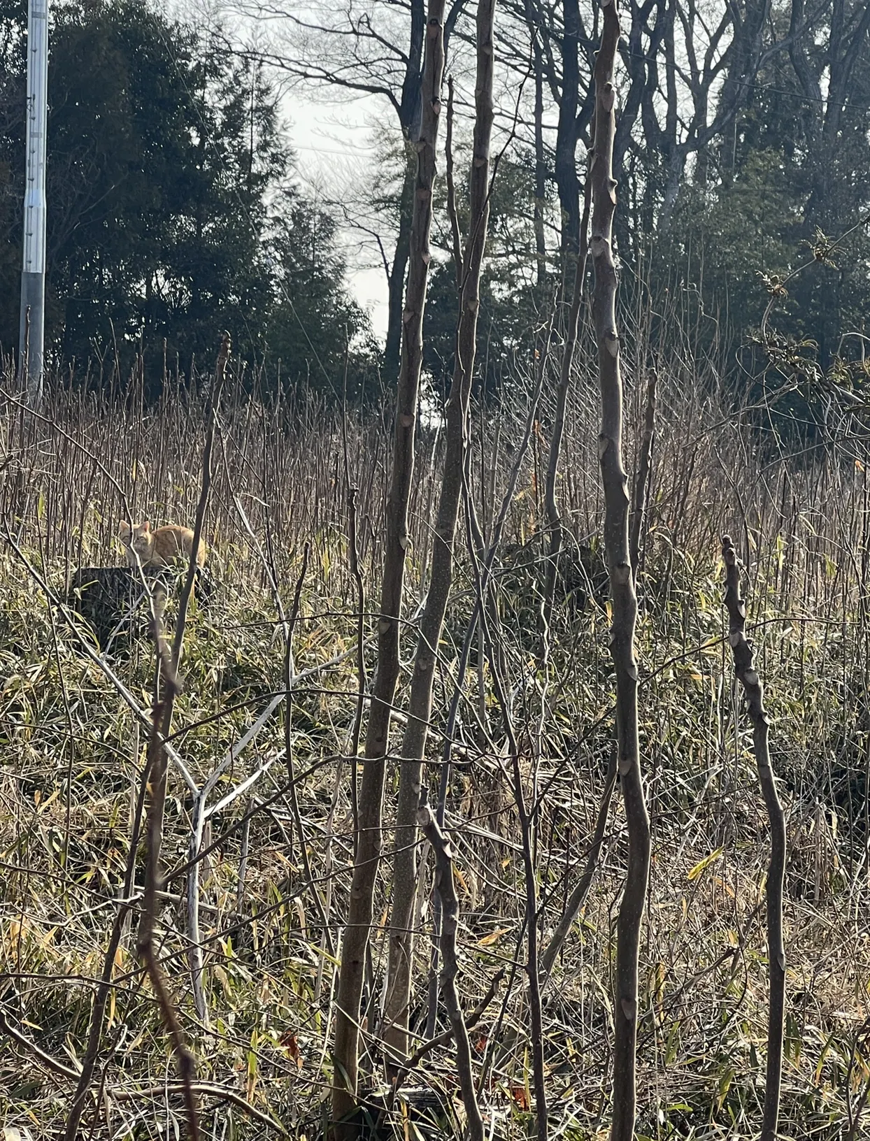 茶とらの猫さんが里山の中の切り株に乗って日向ぼっこしています。