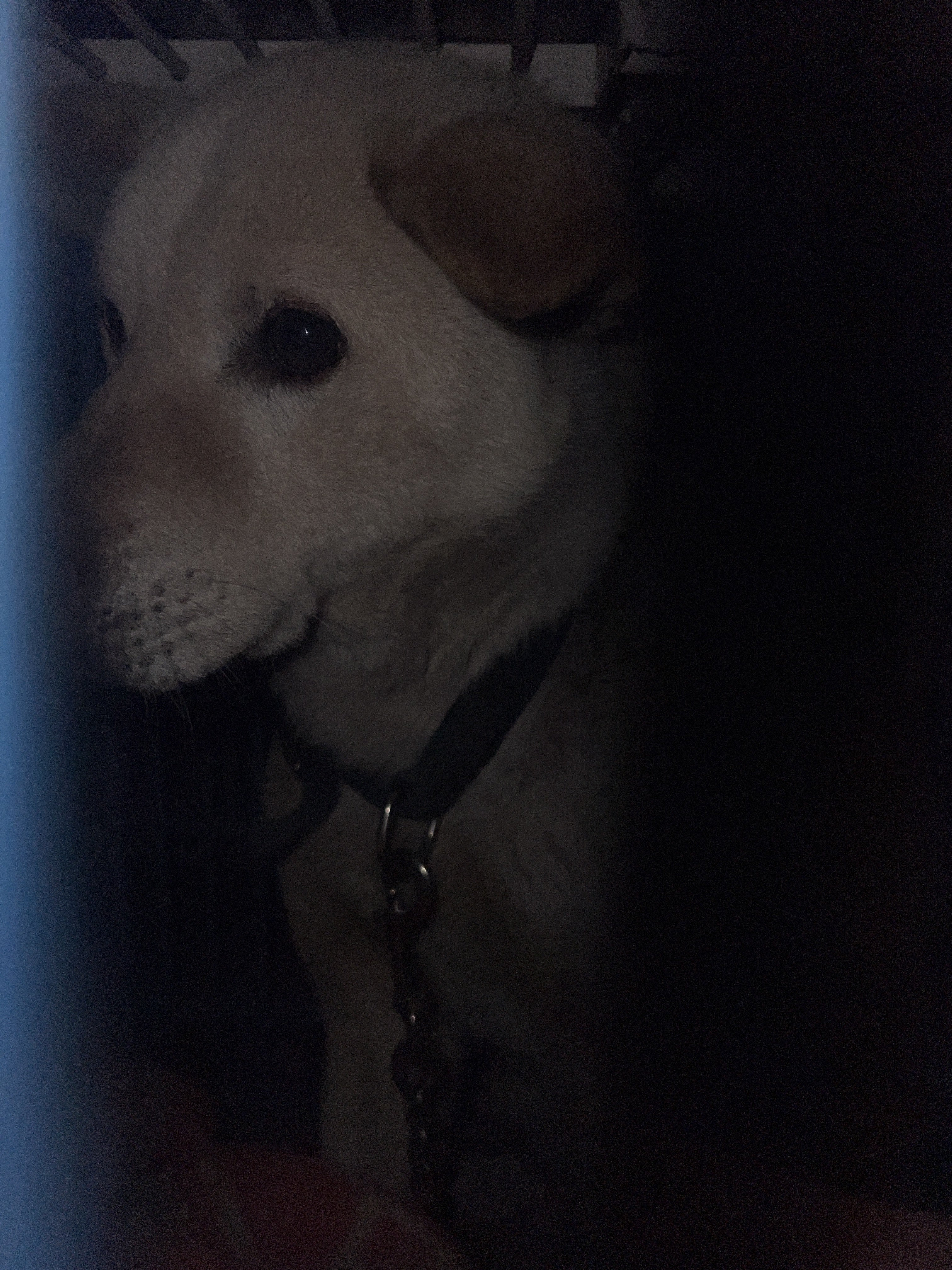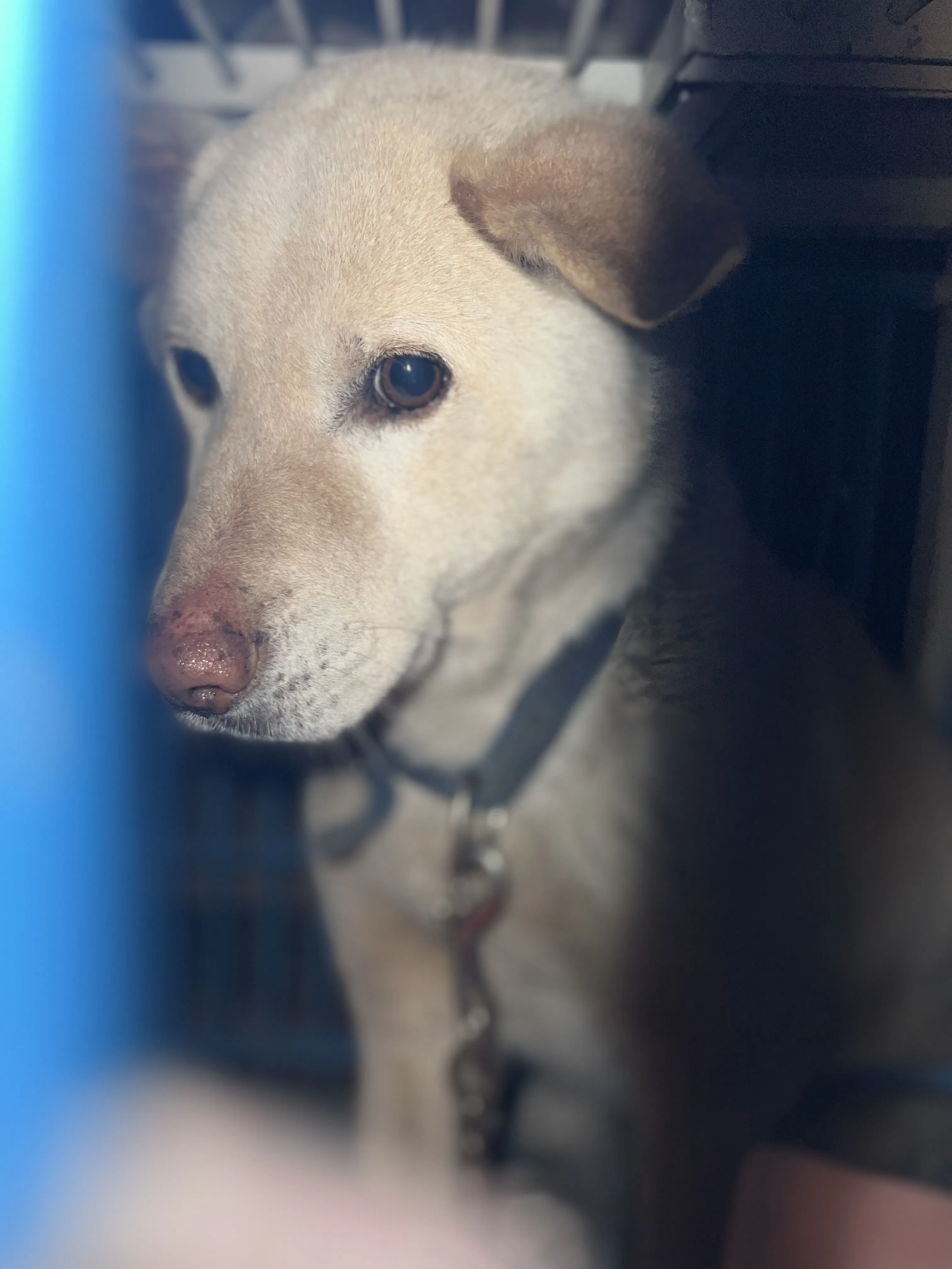 チェーンがついたままの青い首輪をつけています。