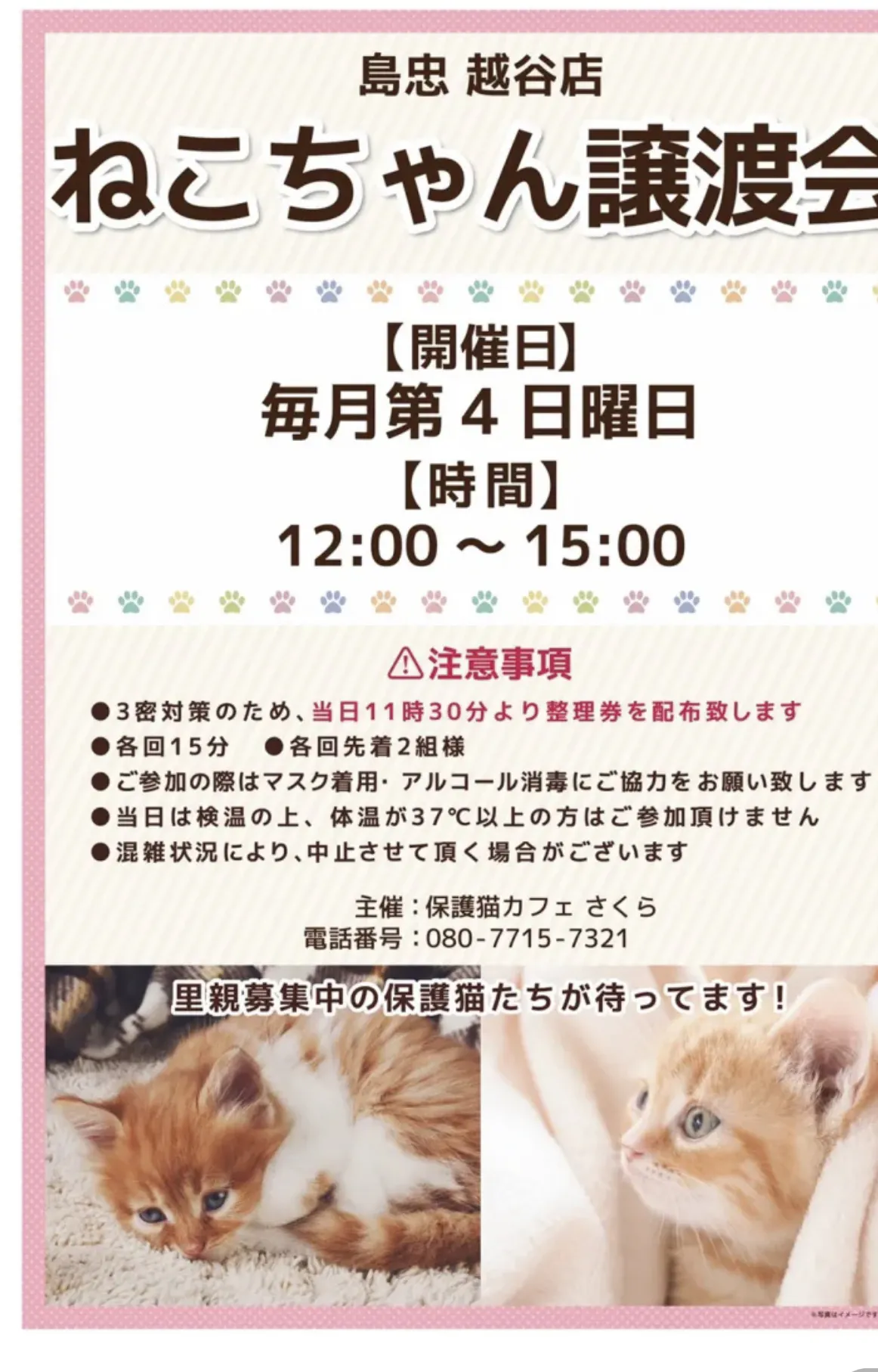 保護猫カフェさくらさん主催の島忠越谷店での譲渡会に参加します。