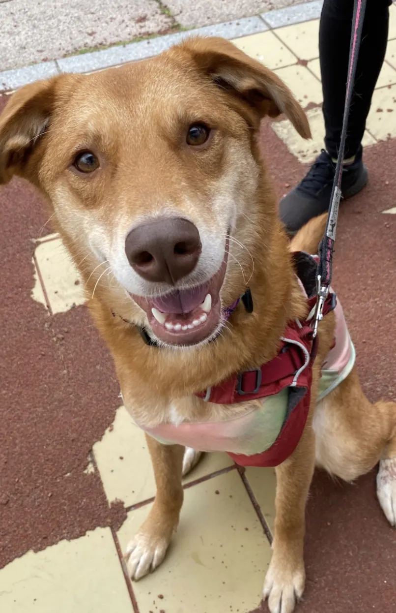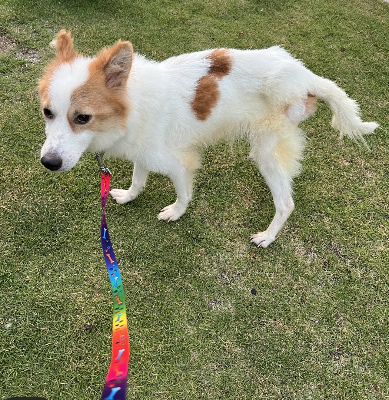リードの長さが短いのか距離が近すぎで緊張してしまうめめちゃん。