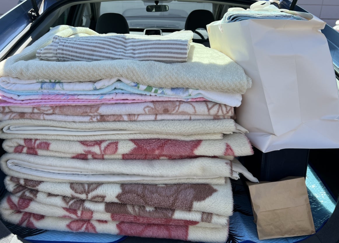 I様から毛布やタオル等ご支援いただきました。