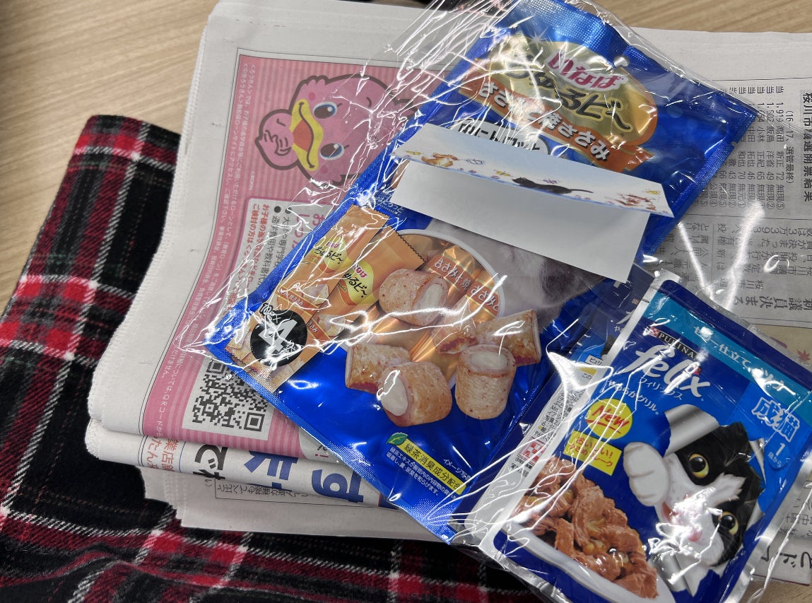 M様から新聞紙と猫さんフードご支援いただきました。