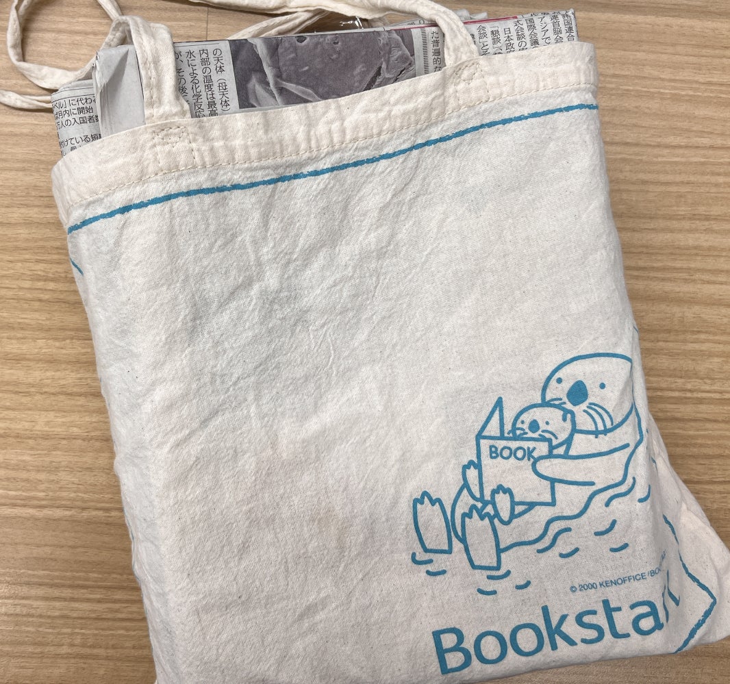 このトートバッグ、ブックスタートといって赤ちゃんへ読み聞かせしながら絵本を配る事業のものです。