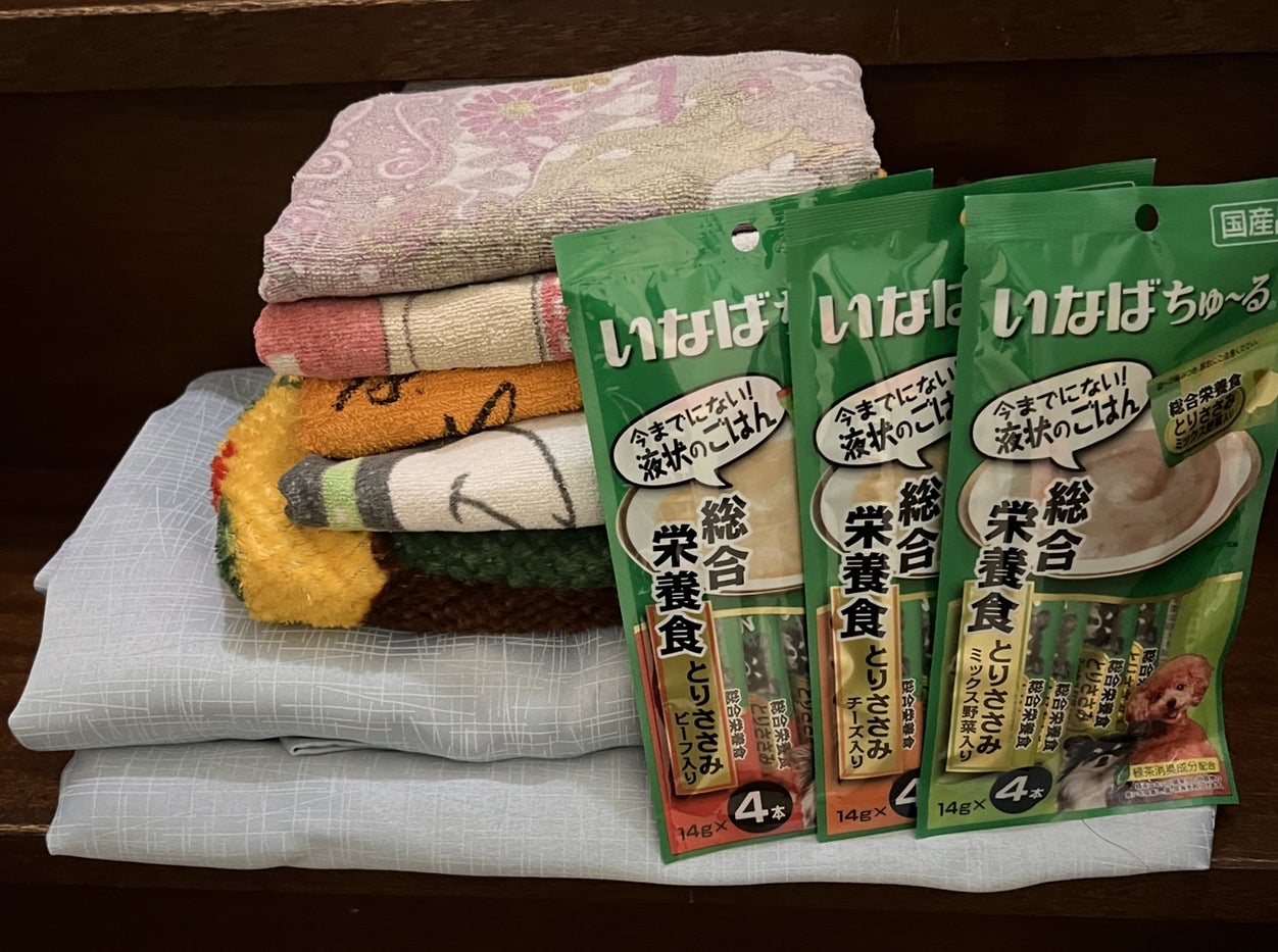 O様からタオル等とわんちゃんチュールご支援いただきました。