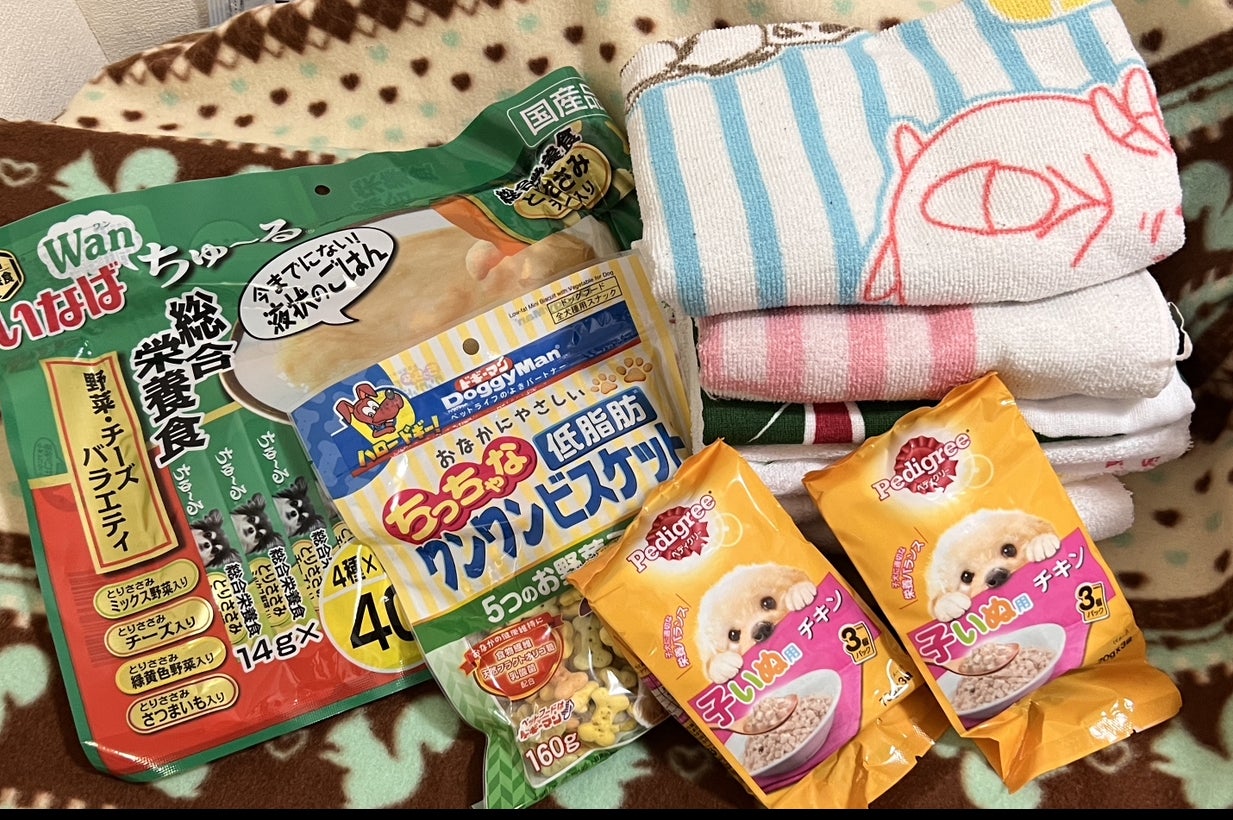 A様からわんちゃんフードやタオル等ご支援いただきました。