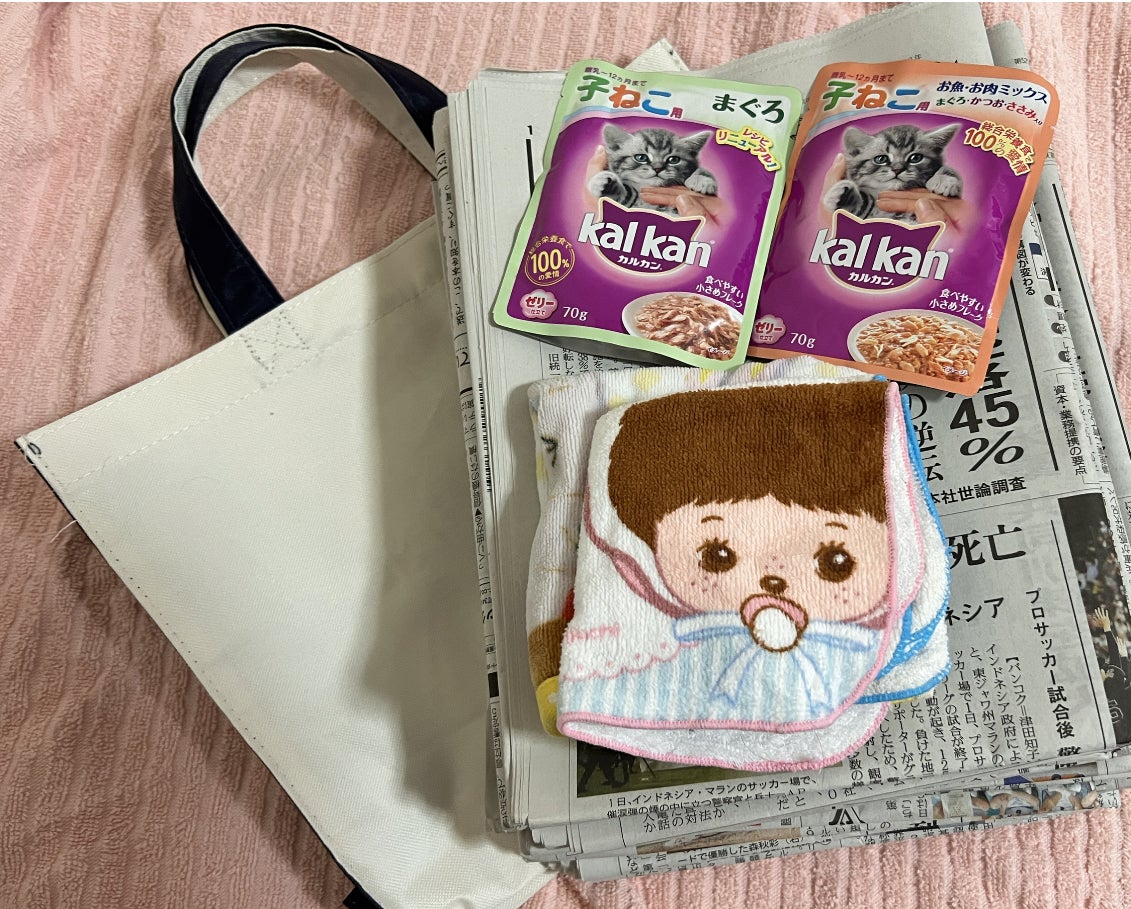 M様から新聞紙、ハンカチタオル、子猫ごはん等ご支援いただきました。