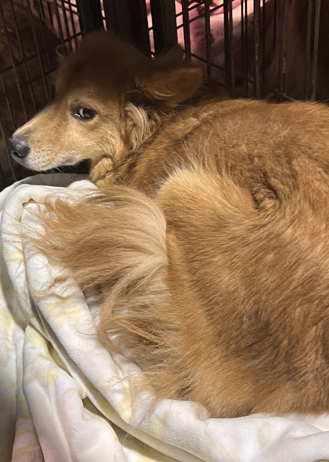 (毛布大好き♪)施設にいる成犬ちゃんたちは、今は、毛布半分くらいの広さのケージに