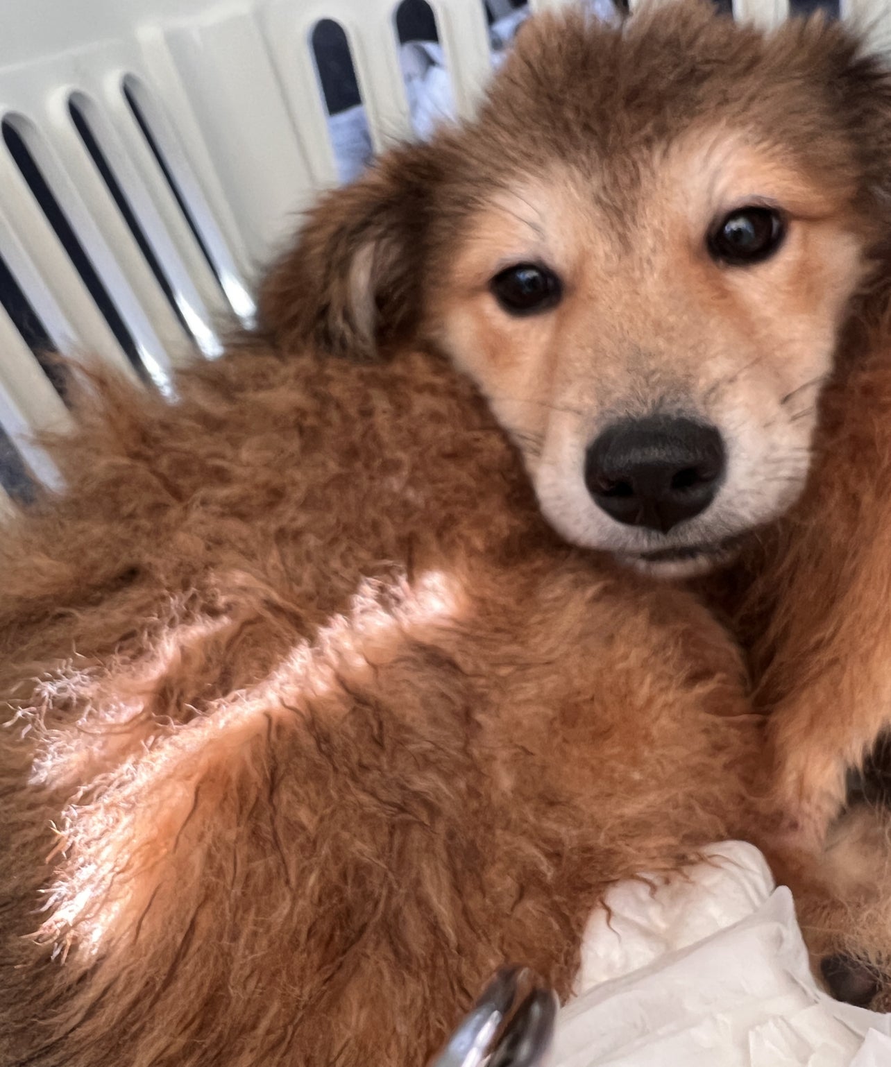 施設にいる成犬ちゃんたちは、毛布半分くらいの広さのケージにひとりひとり過ごしています。