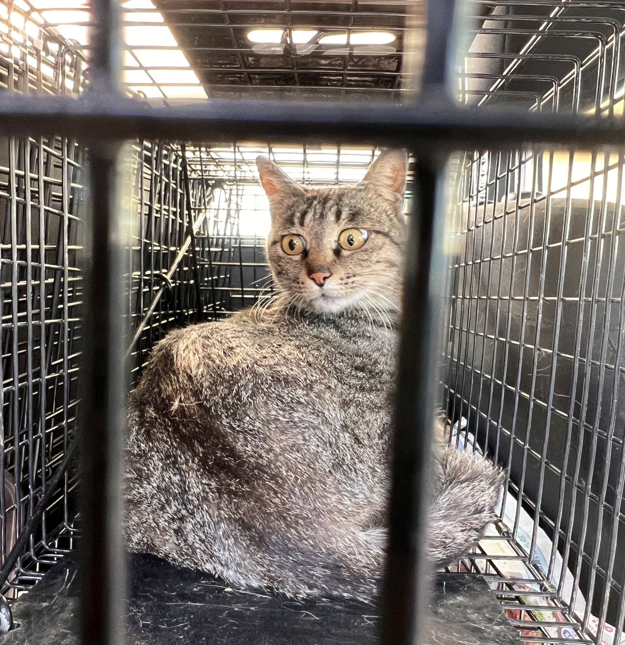 私の服の猫の毛が、直前までの格闘を物語っております。