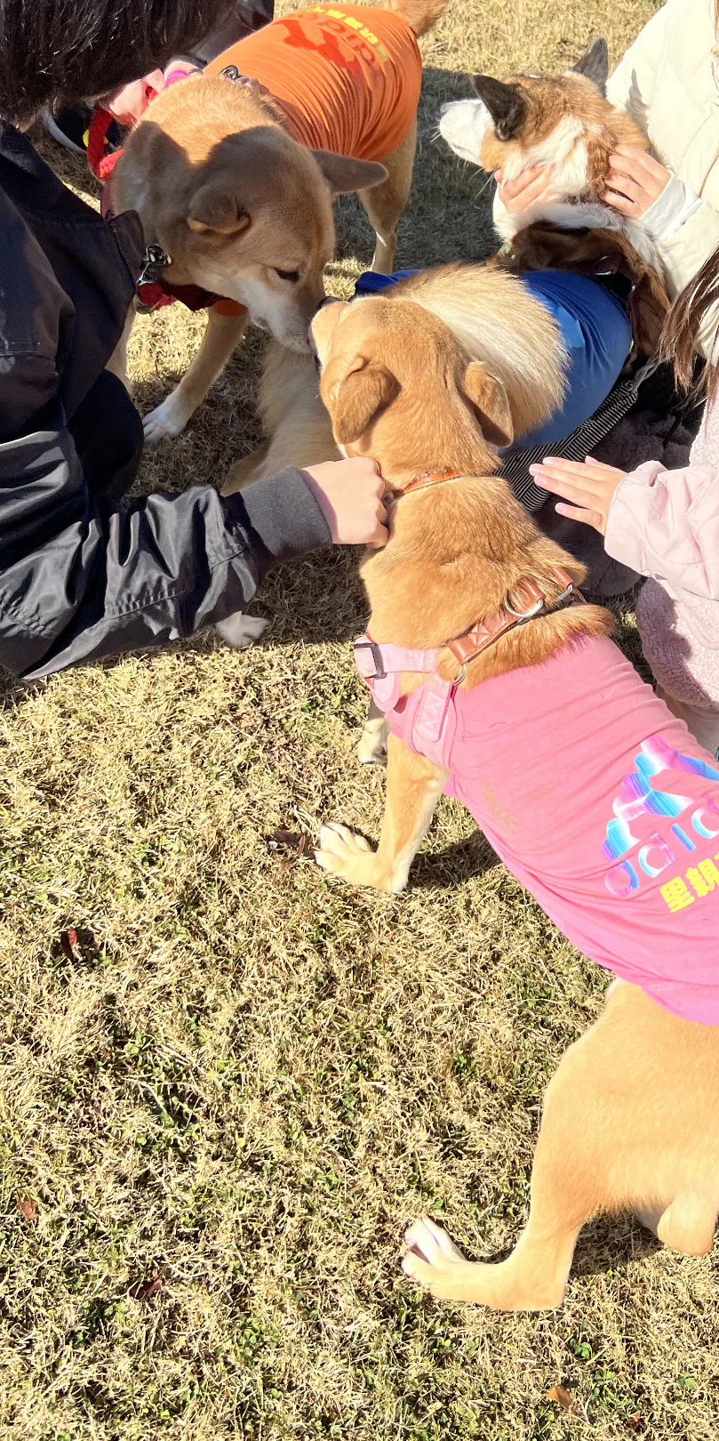 ↑ドッグランのお客様のわんちゃんとも仲良い むめよちゃん。