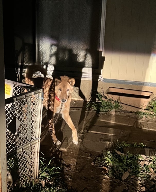 「庭に迷い込んできた大人の犬、紐で繋いでおいた」と