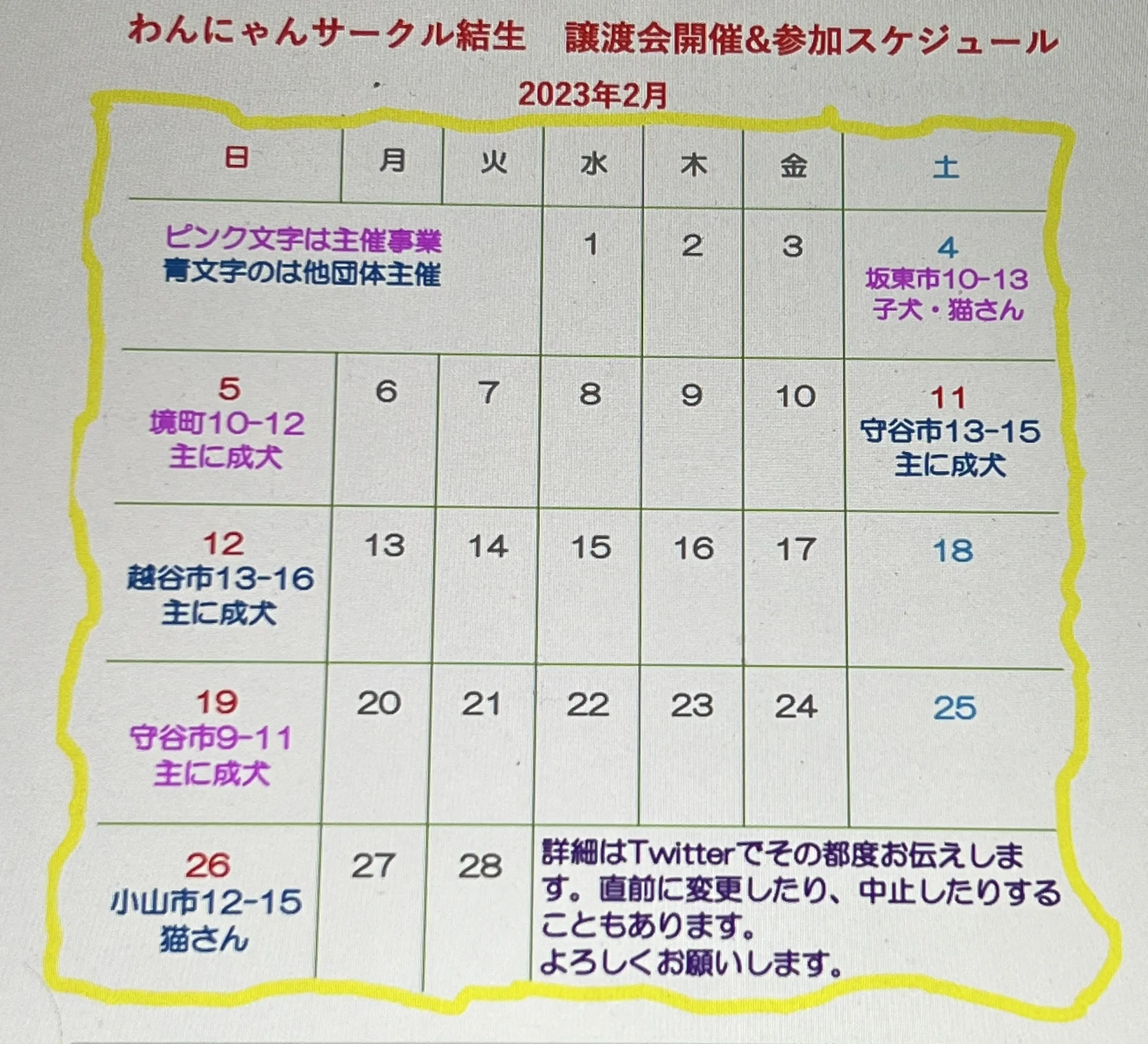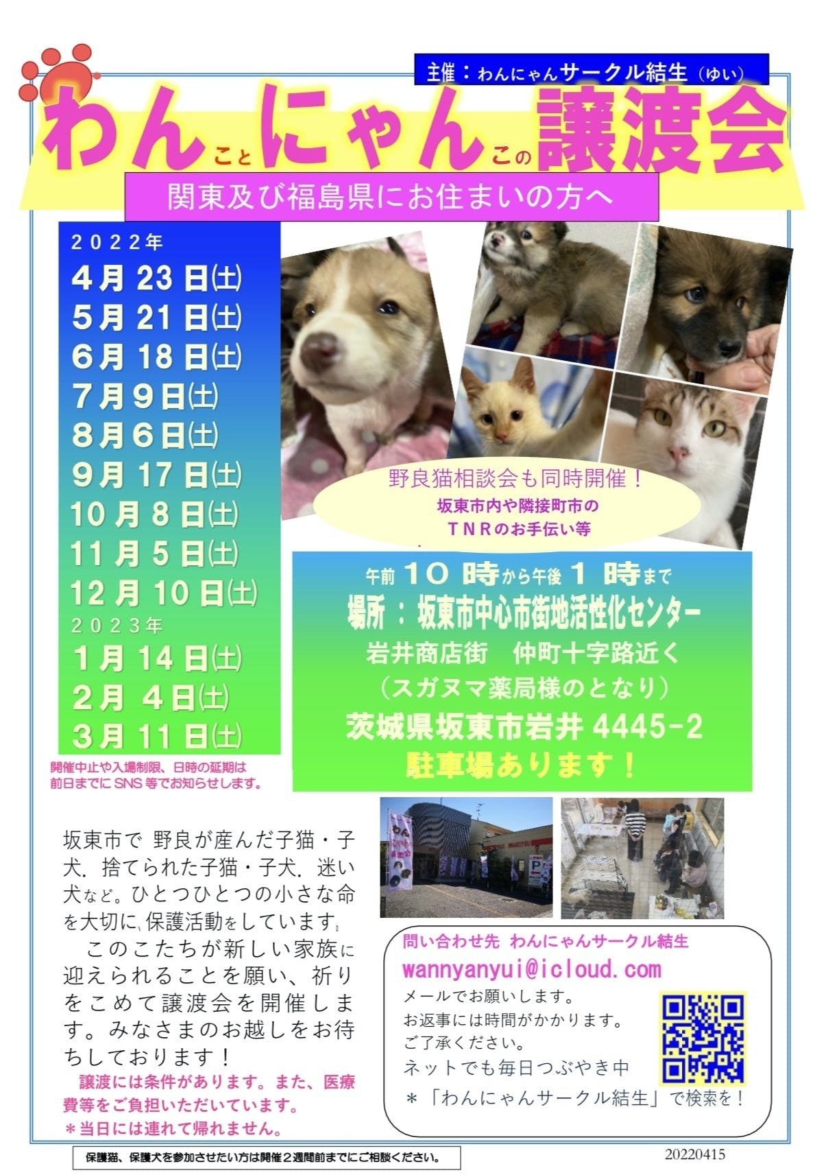 ピンクの文字はわんにゃんサークル結生主催の譲渡会です。