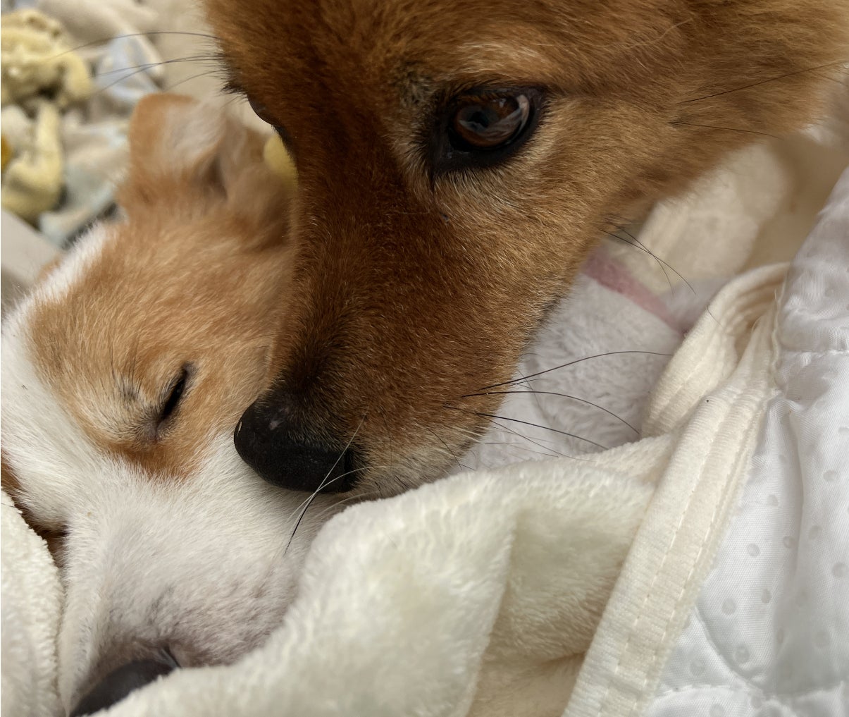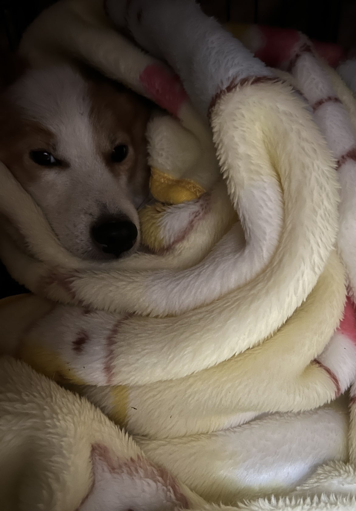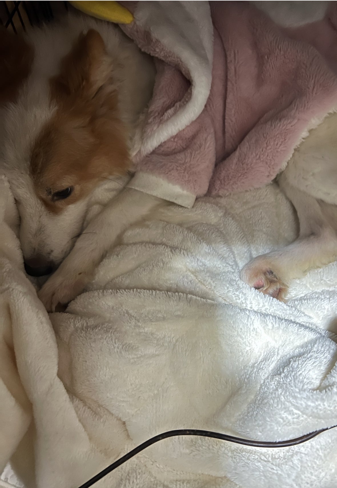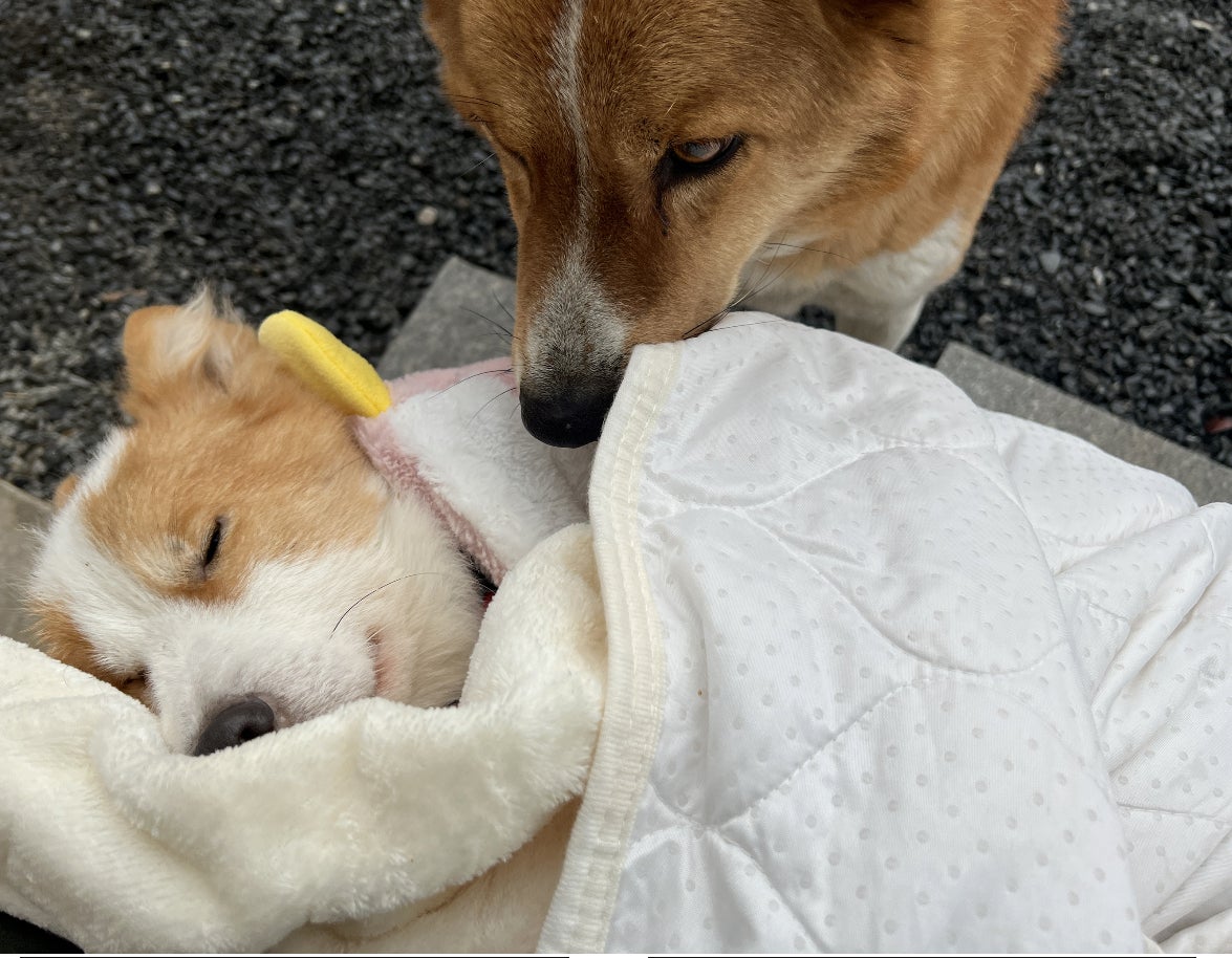 されるがままのめめちゃん。毛布で包んで、湯たんぽして