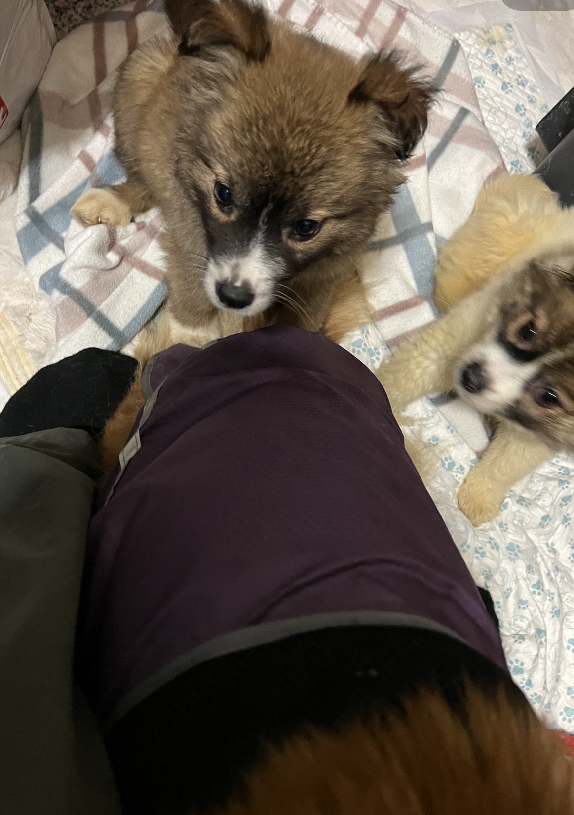 (↑左下が私の足(黒い靴下) 紫色のが先輩わんちゃんの服。)