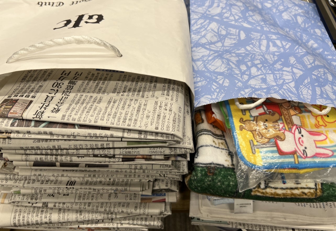 M様からタオル新聞紙などなどご支援いただきました。
