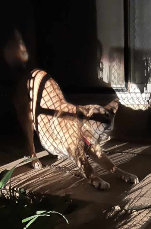 フェンスの影で網目模様のジロくん。