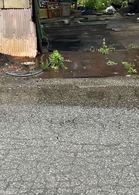 施設の前庭(?)の水たまりは大雨で湖のようになり
