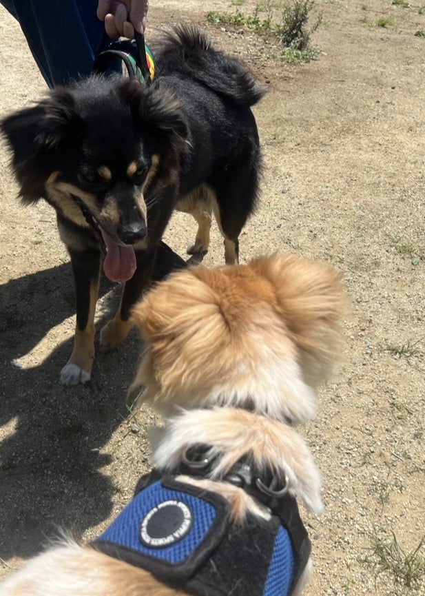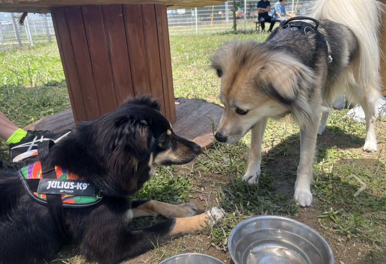 むめよちゃんとお顔合わせをするために先住わんちゃんと一緒に。
