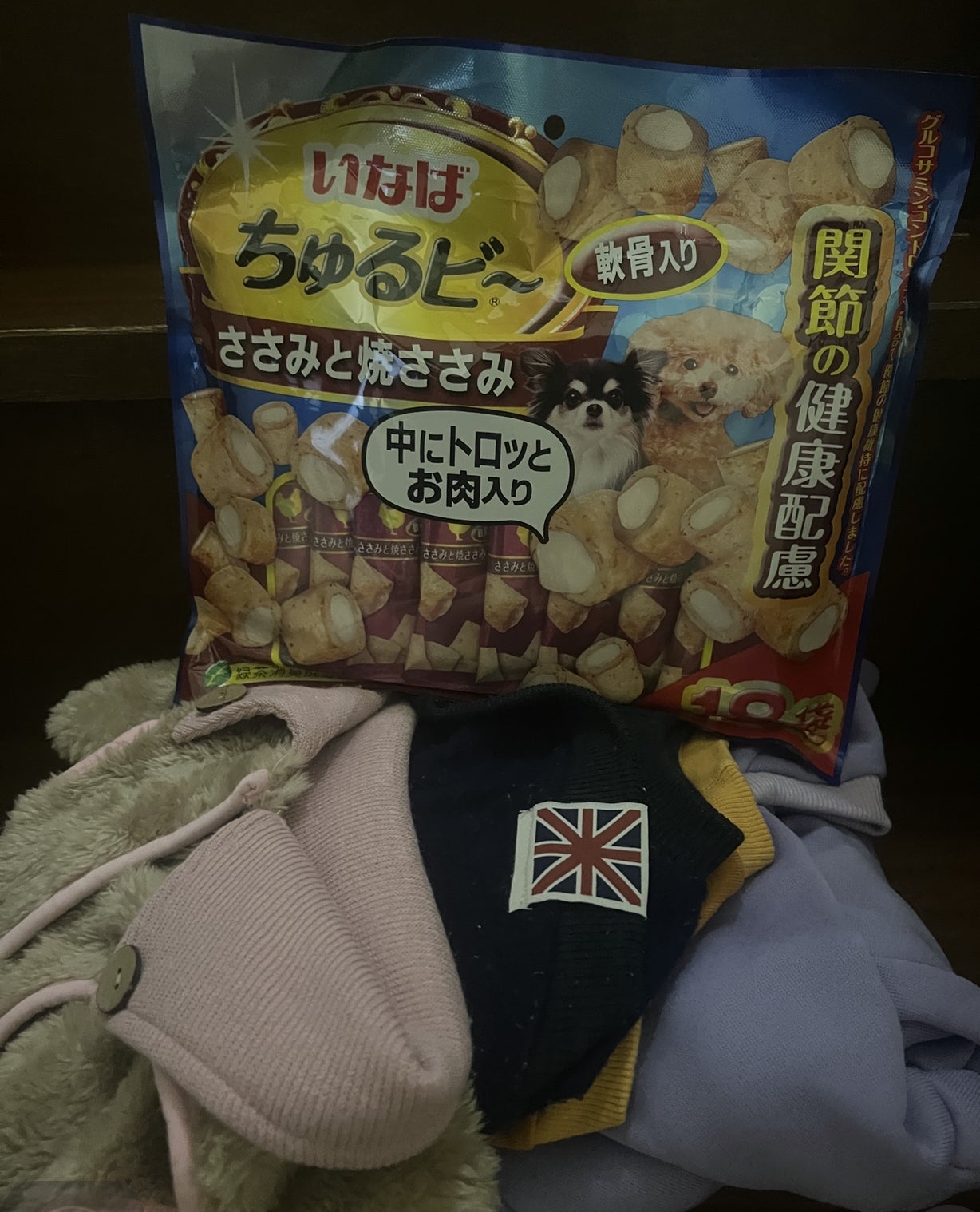 Bママパパ様からわんちゃんおやつと服をご支援いただきました。