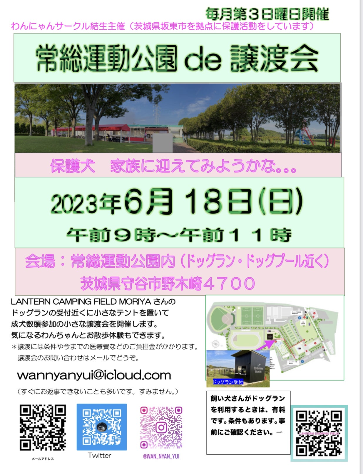 午前中はわんにゃんサークル結生が主催の「常総運動公園de譲渡会」です。