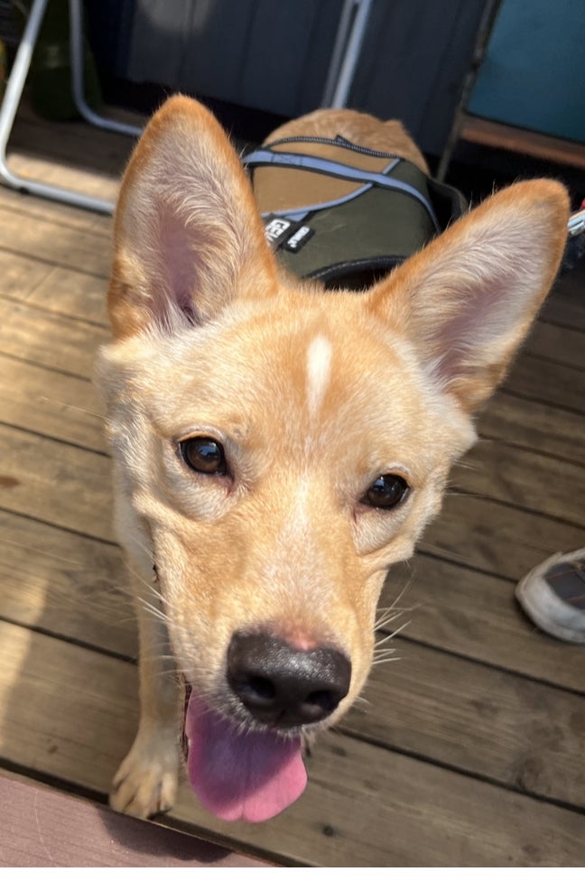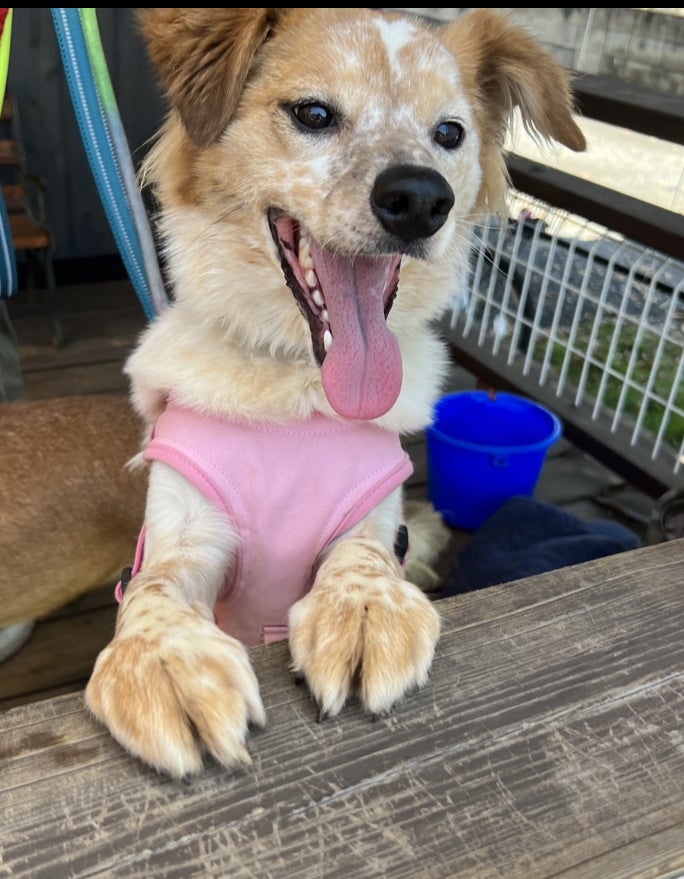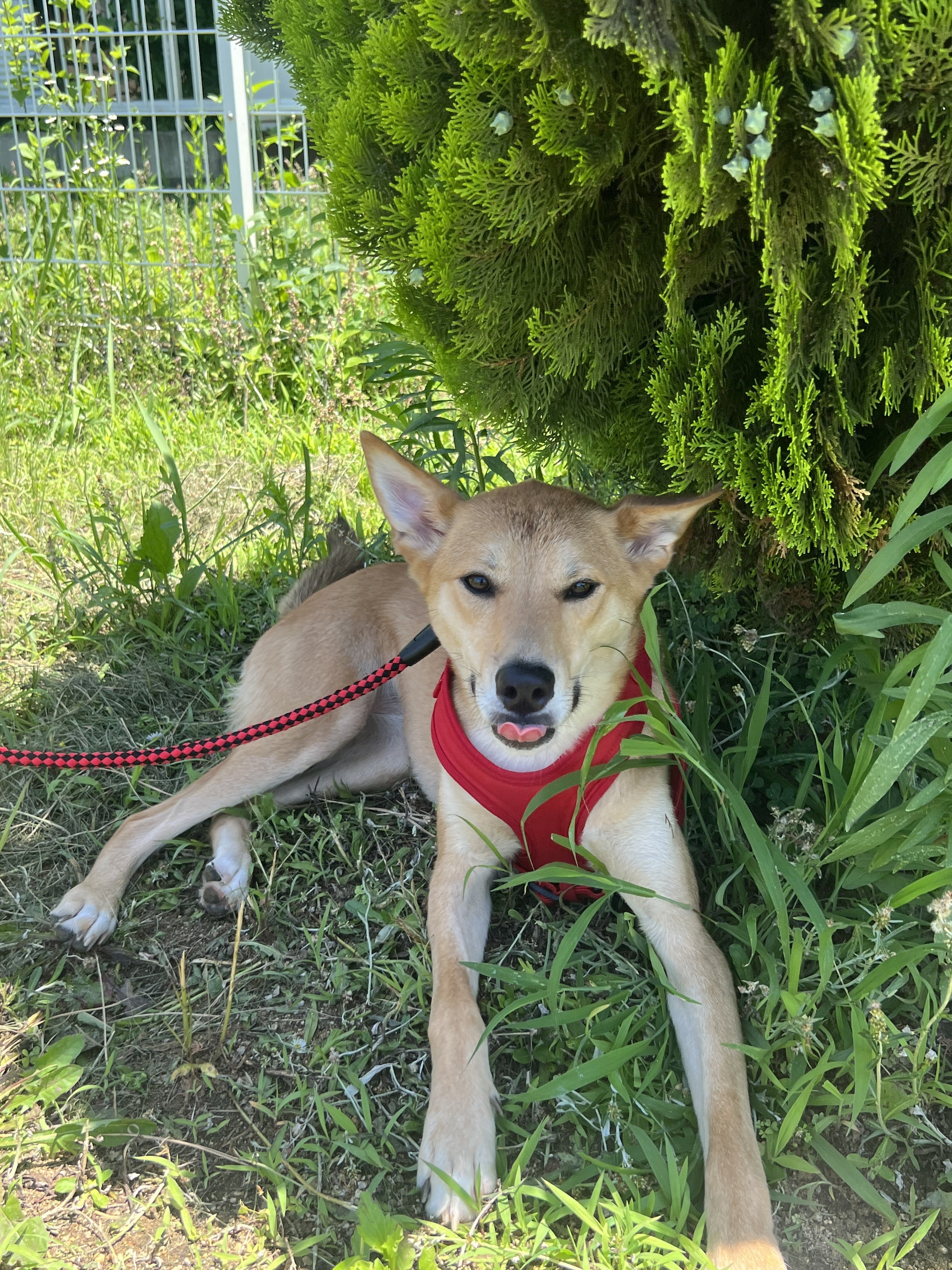 くるくん、今日は、卒業ほやほやのむめよちゃんのおさがりハーネスをつけてみました。
