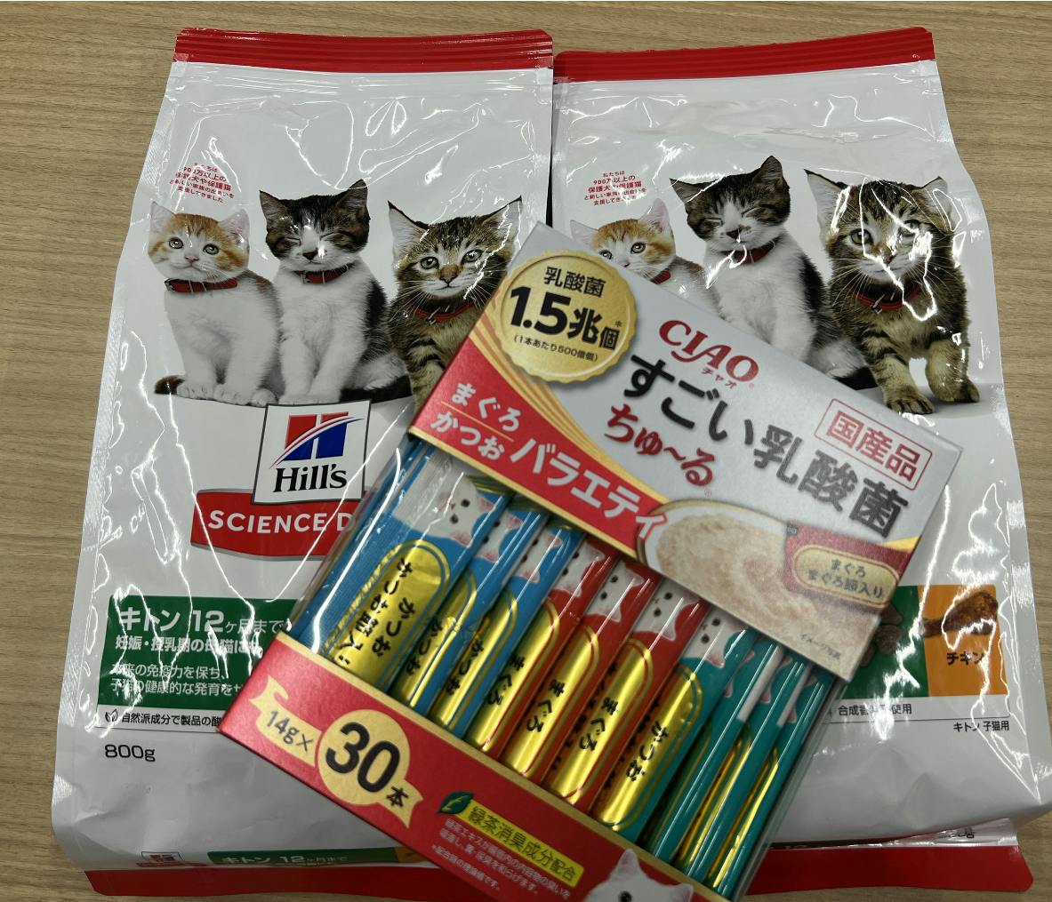 現在は特にウェットフードやチュール(総合栄養食)とペットシートが大量に必要です。