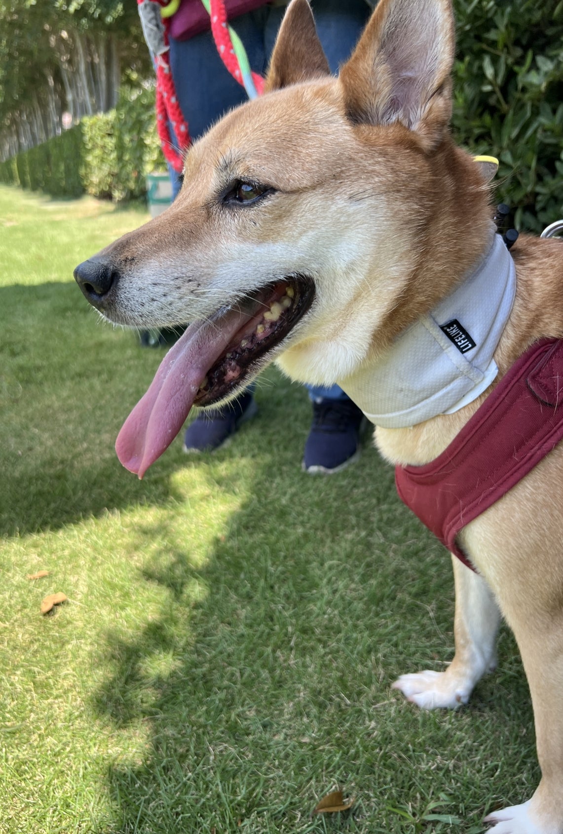 暑さ対策でわんちゃんたちは保冷剤を挟んだクールネックをつけて