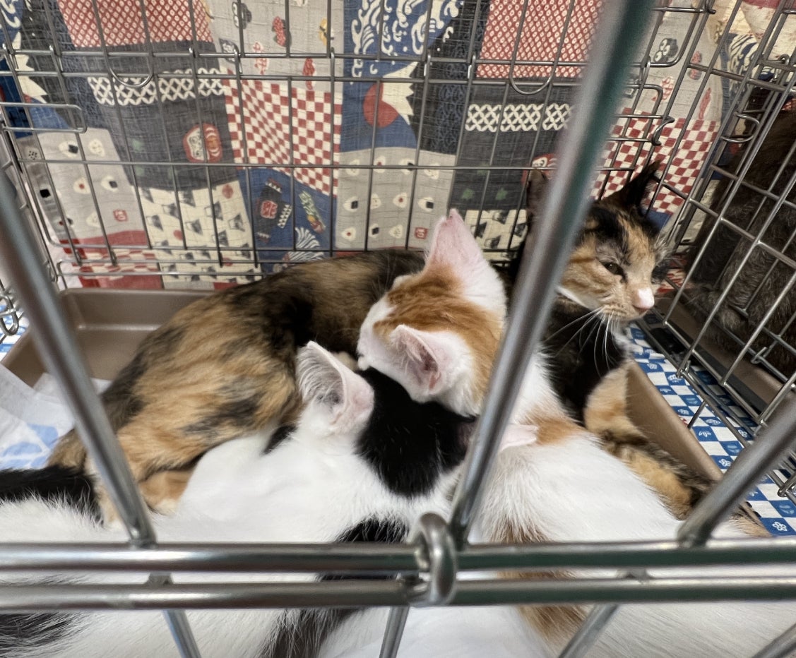 ↑テラちゃん(三毛)、テーくん(白茶)、ラーくん(白黒)親子