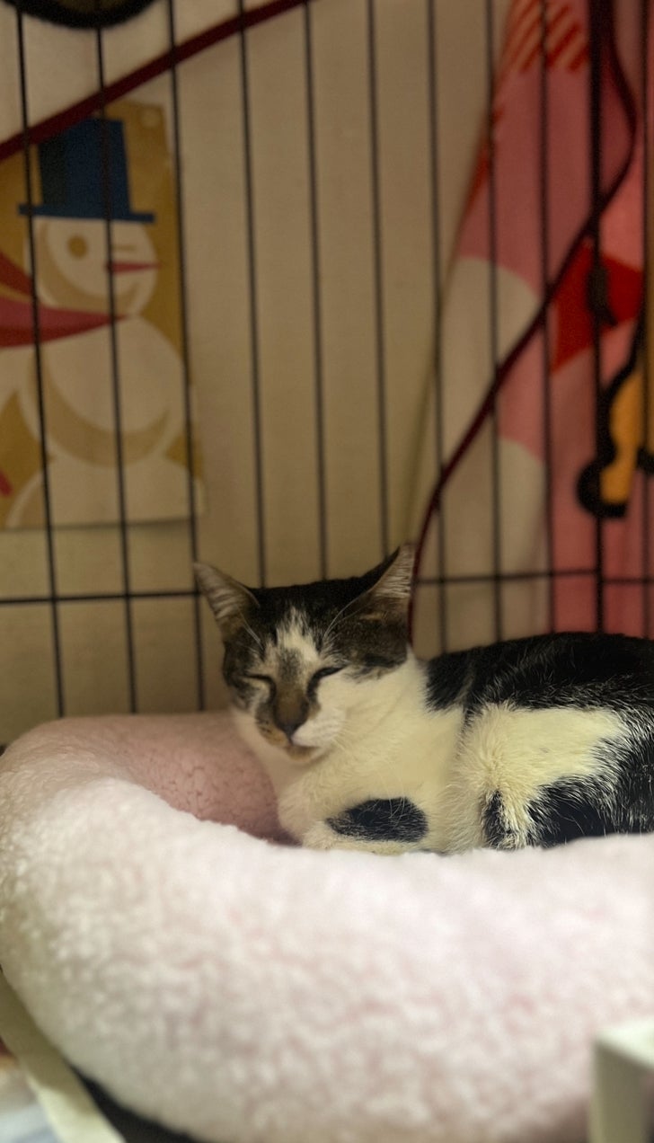 ピンクのベッドでくつろいでいるのは やすはちゃん。