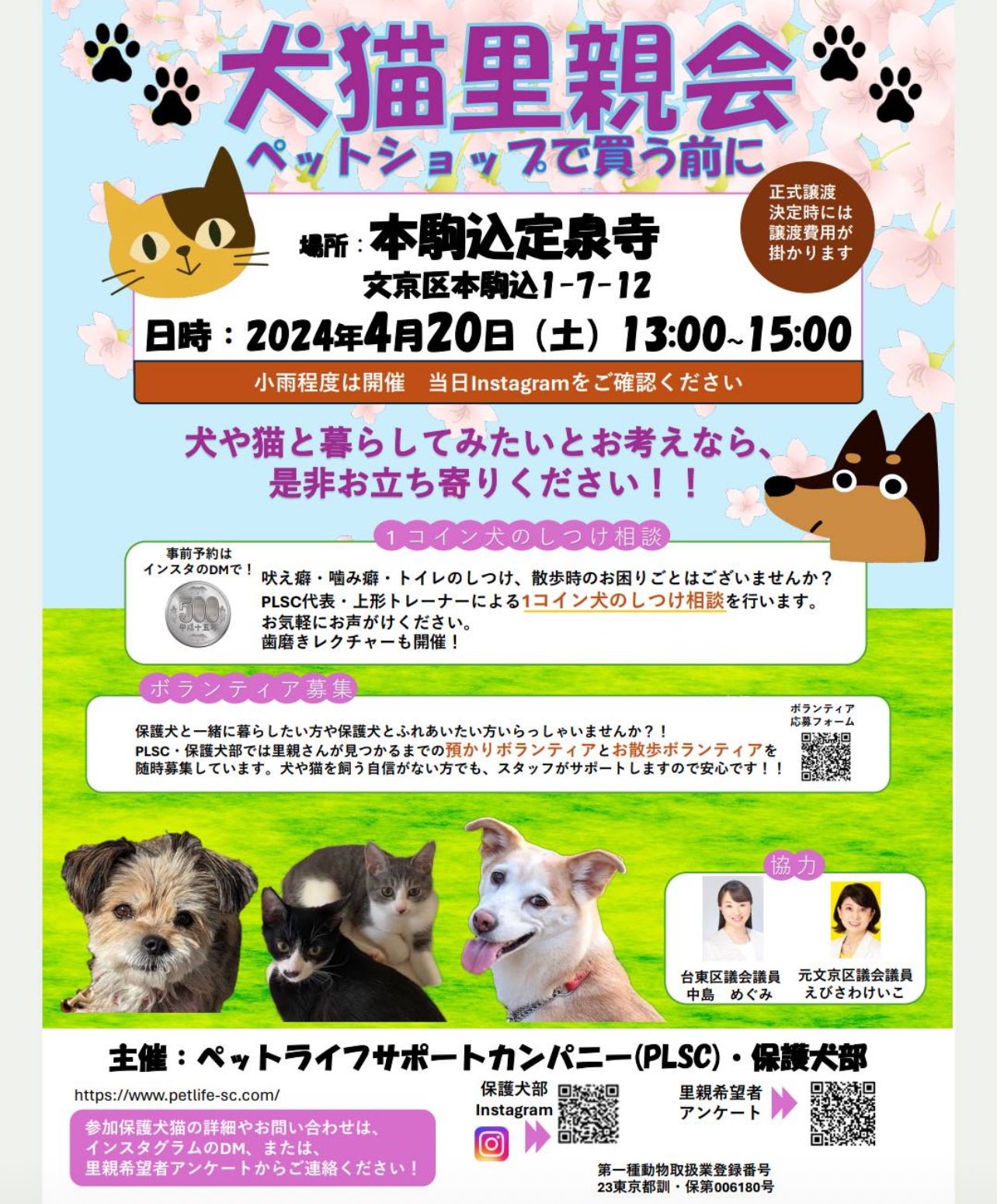 2024年4月22日(月)おはようございます。わんにゃんサークル結生の秋元です。みなさま いかがお過ごしですか?☆ 常総運動公園de譲渡会、プール日和でした☆昨日も初夏のような気候だった茨城県。常総運動公園de譲渡会、無事に開催いたしました。参加わんちゃんは一時預かり施設のさんにん組。そらんちゃんにこじくんとんくん。屋外でテントでの開催で午前9時の開催の時は過ごしやすかったのですがどんどん暑さが押してくる感じに。LANTERN CAMPING FIELD MORIYAさんでは犬種別のオフ会のようなイベントがありドッグランは利用できなかったのですがその分、ドッグプールにはひと家族しか利用していなかったのでプールを利用させていただきました。みんなプール初体験。不安そうなそらんちゃん。(あれ?そらんちゃんは前にもプール体験したような。。。)抱っこして浅くしてある花道のような部分からプールの中へ入っていき後ろあしからそっとプールに浸していきます。そしてプールへ優しく投げ入れます。上手上手♪本当は必死。すぐにプールサイドへ泳いで行ったので引き上げてあげました。とんくんも上手。優しく投げ入れていたつもりなのですがちょっと荒療治的にプールに入れてしまったのでみんな怖かったかもしれないんですが。。。そらんちゃん、その後、誘導花道に入って行こうとしていました。大丈夫だったようです。また機会があったら利用できるといいですね。プールの後の爽やかにこじくん。とんくんもニッコニコ。ご来場いただいたご家族様ありがとうございました。卒業しただなちゃん(保護時のお名前)も家族と一緒に応援に駆けつけてくださりパンフレット配りやとんくんのお世話いらっしゃった方々に譲渡後のお話などしてくださいました。ありがとうございました。いつものNさん、Oさんにも荷物搬入から撤収までしていただきました。感謝です。地元わんにゃんんM'sのSさんもご支援持ってお顔出していただいて嬉しかったです。(プール中だったのでちょこっとのやり取りだけで失礼しました)撤収後、常総運動公園窓口で次回利用の手続きをしたのですが職員さんが声をかけてくださり使っていたケージを寄付したいとおっしゃってくださいました。ありがたかったです。みなさまの応援で譲渡会も開催できていること心がじわっとしました。わんちゃんたちも大満足だったようで譲渡会の後、帰り道では車の中でみんなぐっすりでした。とてもいい1日でした。LANTERN CAMPING FIELD MORIYAさんプール体験いい機会をありがとうございました。☆4月20日の 犬猫里親会 欠席したのにパネルが♪☆4月20日のペットライフサポートカンパニー(PLSC)保護犬部さん主催の犬猫里親会。欠席したのですがパネルを作って宣伝してくださいました。(譲渡会の様子の写真を送ってくださった中から切り抜いてみました。)ホームページのQRコードも大きく出してくださいました。おかげさまでホームページの閲覧件数が1日35件を超えました。ありがたかったです。参加のわんにゃんたちもいいご縁がありますように。☆にゃんこの大冒険さんも☆21日は親しくさせていただいているにゃんこの大冒険さんも猫さんの譲渡会がありました。ドッグフードの寄贈があったのでいただけるとのこと。ドッグフードが足りないことを伝えていたのですがすぐに対応してくださいました。感謝です。☆4月は譲渡会、あと2回予定しています☆4月の譲渡会の予定の詳細はこちらからどうぞ。29日の主催譲渡会、一緒に開催のお手伝いをしてくださる方切に募集しています。都内なので車よりも電車を利用した方が便利かもしれません。地下鉄銀座線稲荷町駅出口から道渡ってすぐなので迷うことはないと思います。12時の準備から来ていただけるとすごく助かります。人数によって連れていくわんにゃんが減ってしまうこともあります。事前にお手伝いできましたらメールいただければと思います。一度もお会いしたことのない方でも気軽にどうぞ。wannyanyui@icloud.comお待ちしています。今日も読んでくださりありがとうございました。みなさま、素敵ないちにちになりますように。感謝を込めて。 わんにゃんサークル結生 秋元久美子