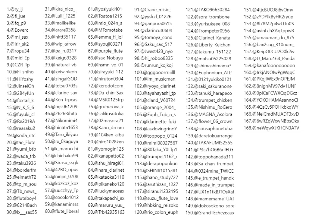 ・木管楽器 - ピッコロ、フルート、オーボエ、バスーン、エスクラリネット、クラリネット、アルトクラリネット、バスクラリネット、ソプラノサックス、アルトサックス、テナーサックス、バリトンサックス。