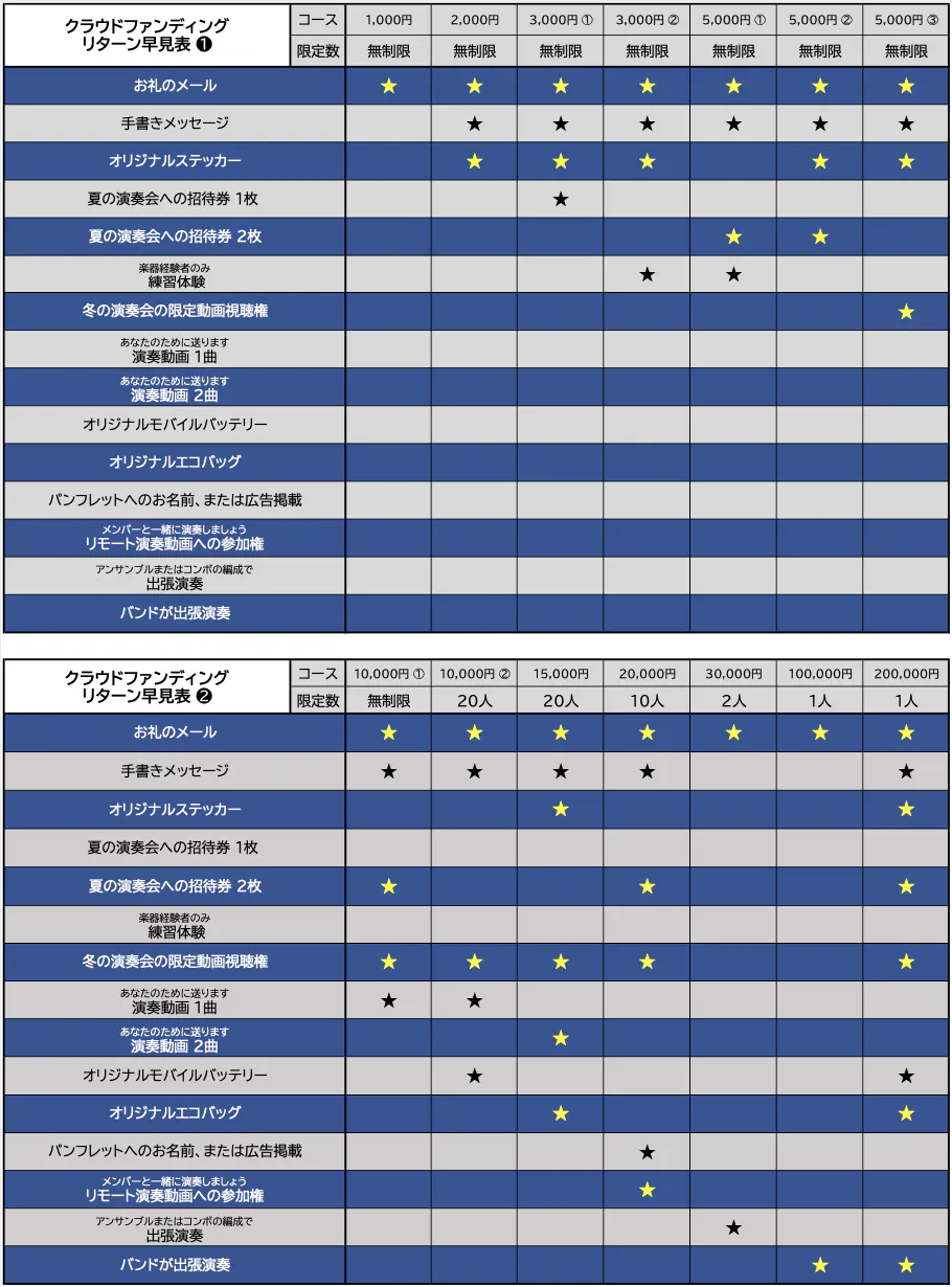 支援していただいた皆さまには、会場に足を運べる方でも、そうでない方でもKSP All Starsの演奏を楽しんでいただけるリターンを多数ご用意しておりますので、ぜひ楽しみにしていてください!